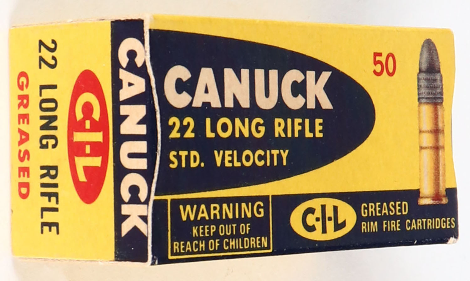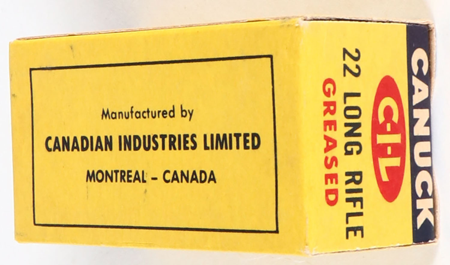C.I.L., Canuck, .22 Long Rifle, Standard Velocity, RHWeb: (Canada) CIL-6 LR-5, Full, 1pc. Yellow & blue box, box is near mint with minty color, only very minor corner wear, edges are crisp, end flaps are solid, ammo is very good to excellent. Grade: Excellent ++ - Value: 6 to 30