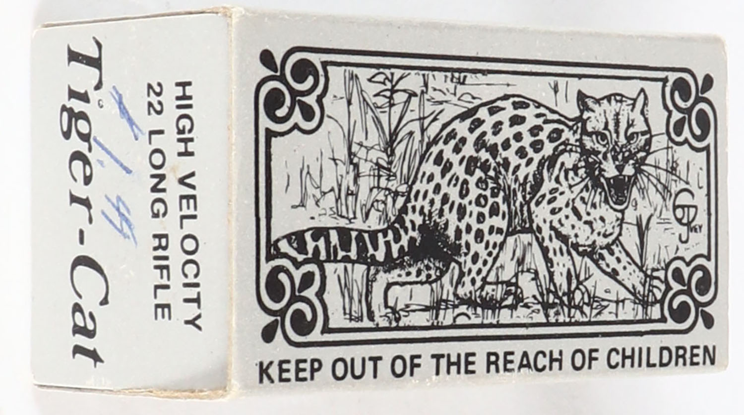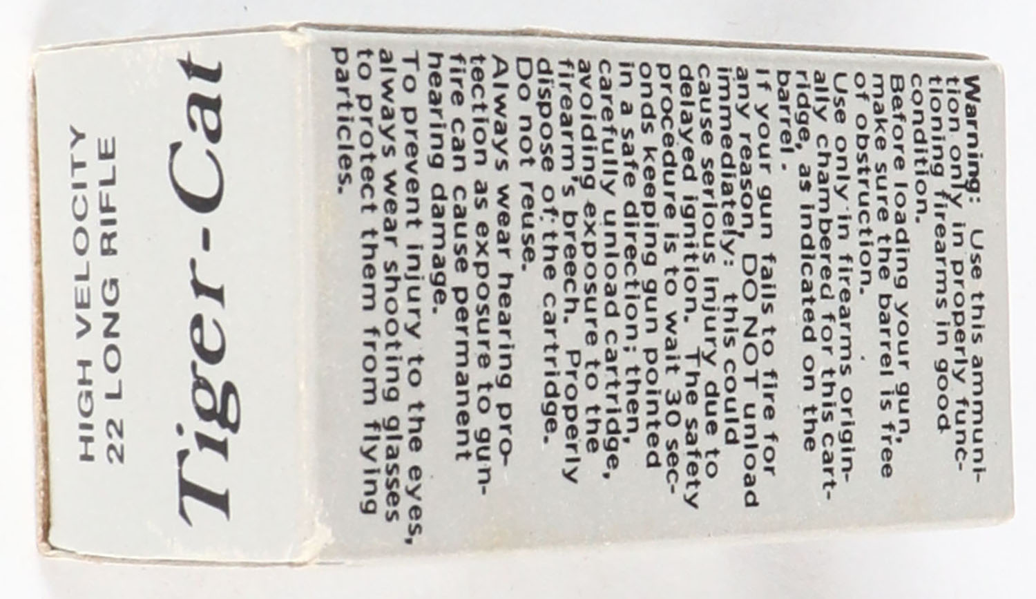 Sovereign, Tiger-Cat, .22 Long Rifle, High Velocity, RHWeb: SGD-1 LR-1a, Full, 1pc. Silver & black box, box is near mint with minty color, left end flap has been written on, corners are sharp, edges are crisp, end flaps are solid, ammo is excellent to minty. Grade: Excellent + - Value: 30 to 90
