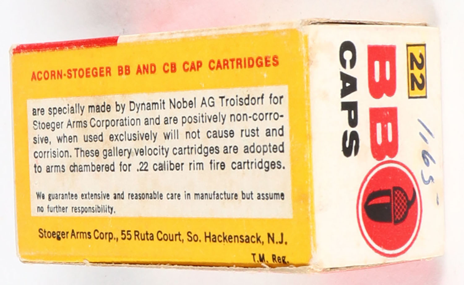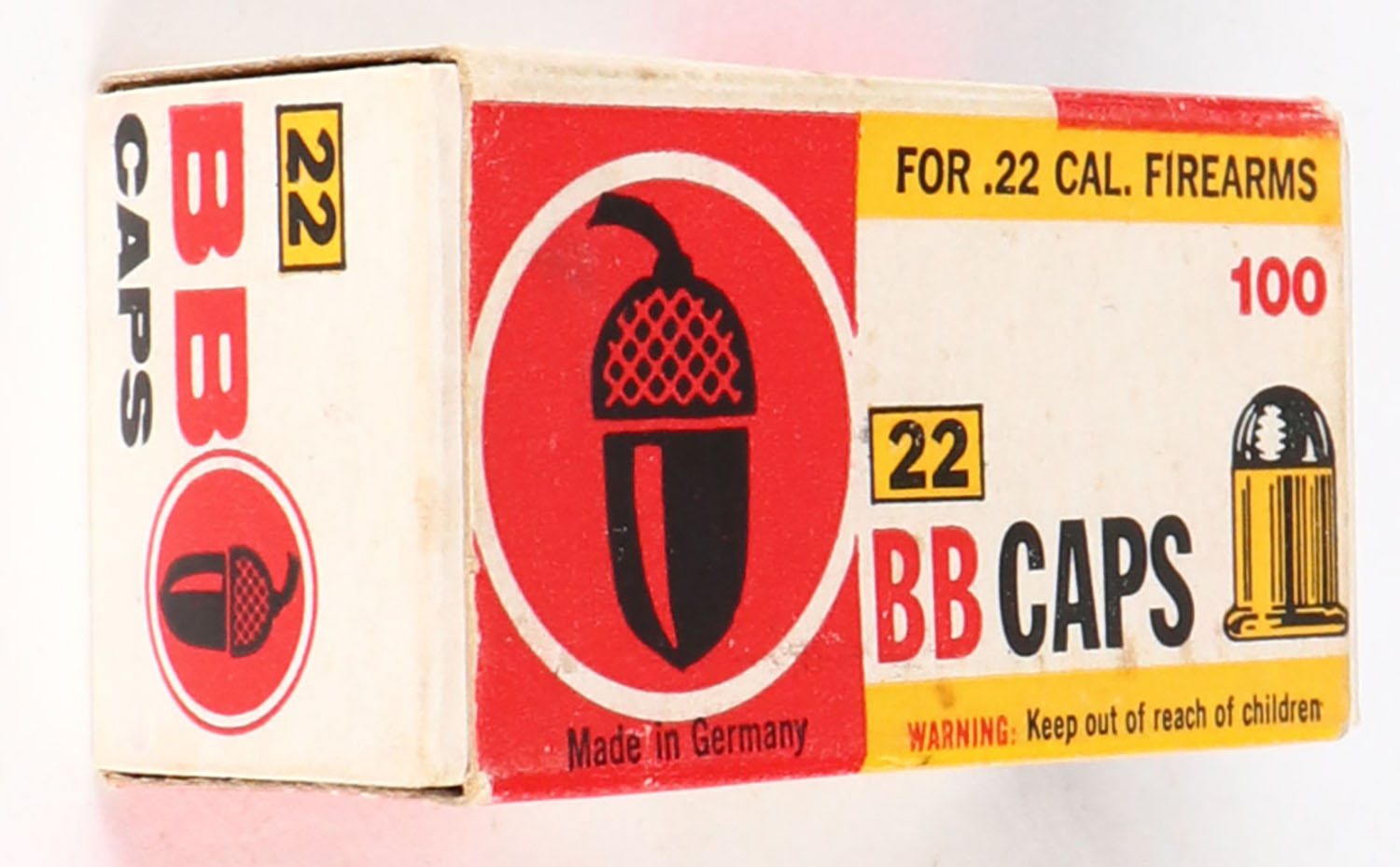 Acorn-Stoeger, .22 BB Caps, Not in RHWeb, Appears full, 1pc. White red & yellow box, box is solid with very good to excellent color, minor age soiling, very minor edge & corner wear, end flaps are solid, ammo is excellent. Grade: Very Good ++ - Value: 8 to 40