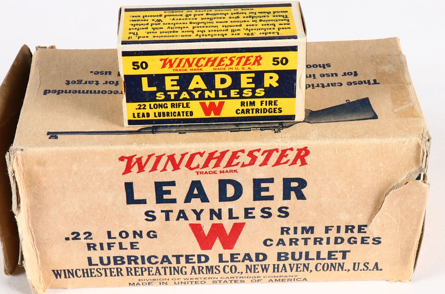 Winchester, Leader Staynless, .22 Long Rifle, Lead Lubricated, Full, 500rds. 1pc. Buff blue & red brick, brick is missing right end flap, left end flap is torn and taped, tear on top, corner wear, minor edge wear, inside boxes are minty. Grade: Fair ++ - Value: 80 to 240