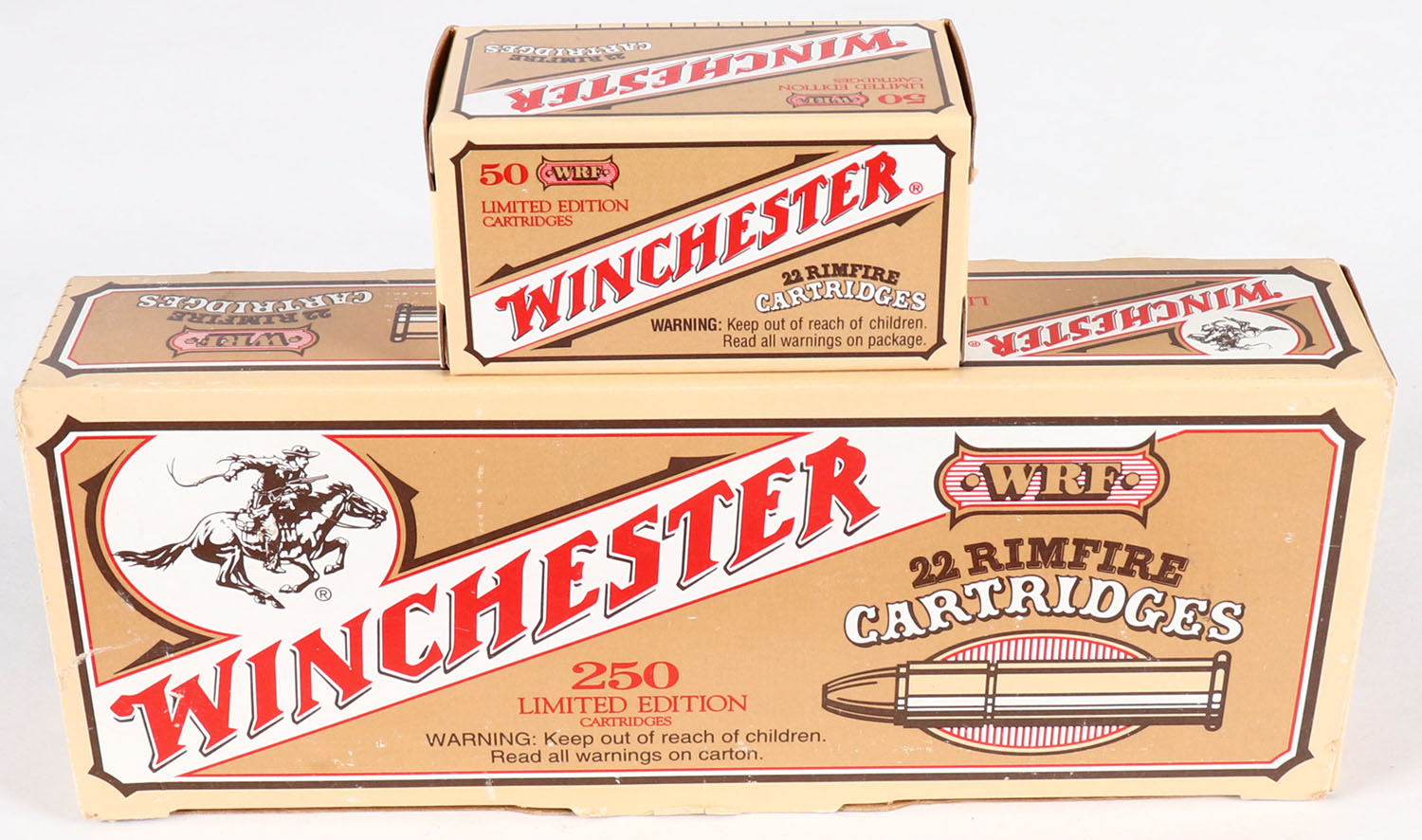 Winchester, .22 WRF, 1997 Limited Edition, Full, 250rds. 1pc. Brown & tan brick, brick is solid with minty color, very minor shelf & edge wear, minor corner wear, top flap is solid, inside boxes are mint. Grade: Excellent + - Value: 40 to 120