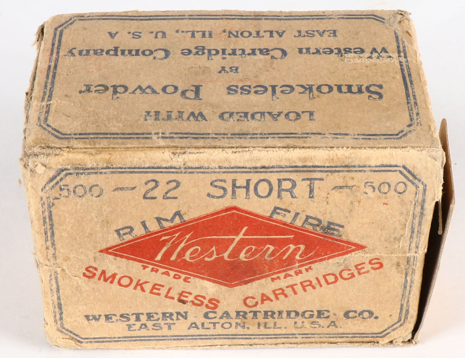 Western, Smokeless Cartridges, .22 Short, Empty, 1pc. Buff red & blue brick, brick is missing right end flap, left end flap is torn & taped partial seam split to top front edge, very good color, some age soiling, edge & corner wear. Grade: Fair - Value: 10 to 50