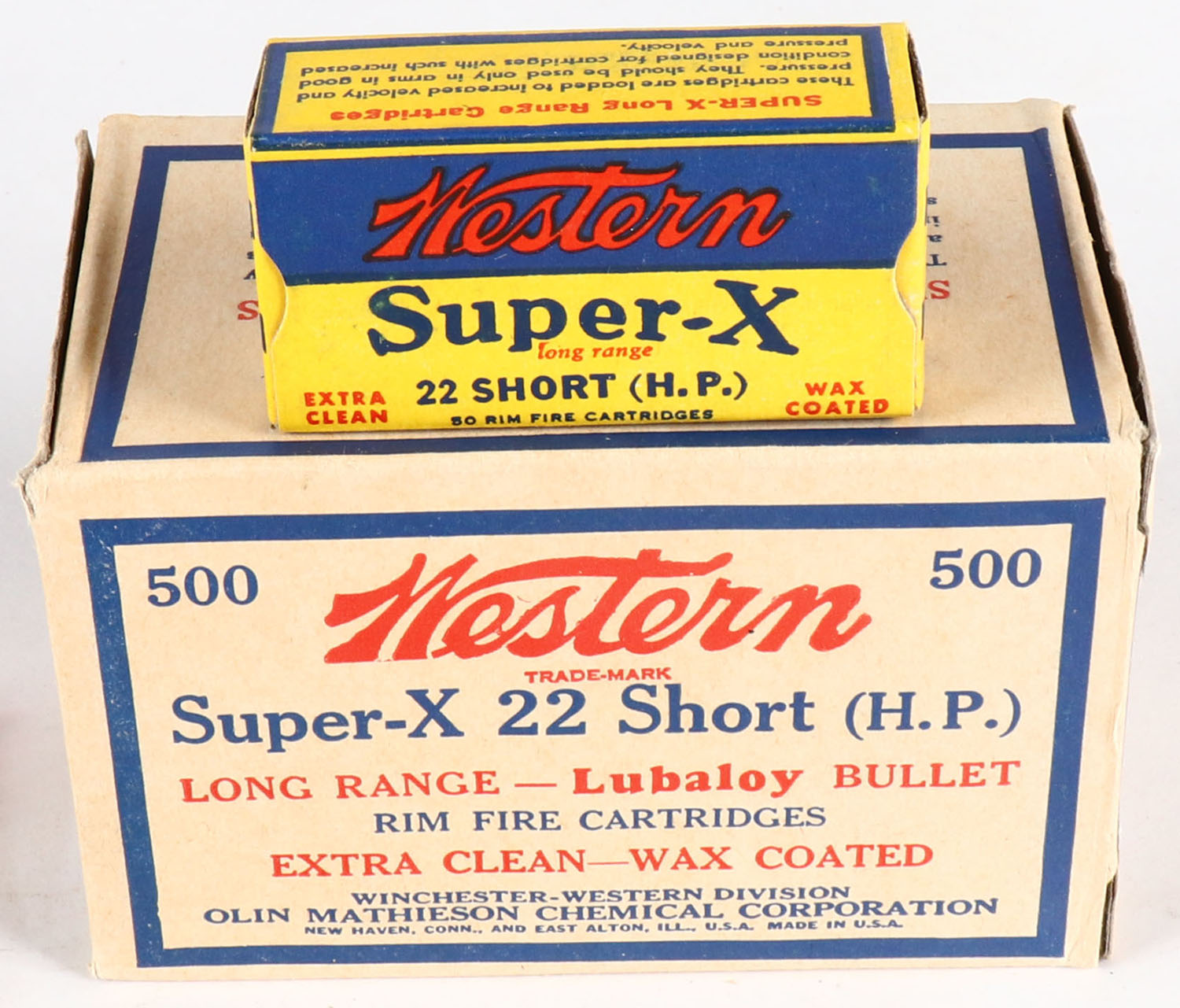 Western, Super-X, .22 Short Hollow Point, Extra Clean Wax Coated, Full, 500rds. 1pc. Buff blue & red brick, brick is solid with minty color, 2 small tears on right end flap, minor corner wear, edges are crisp, end flaps are solid, inside boxes are minty. Grade: Excellent + - Value: 200 to 800