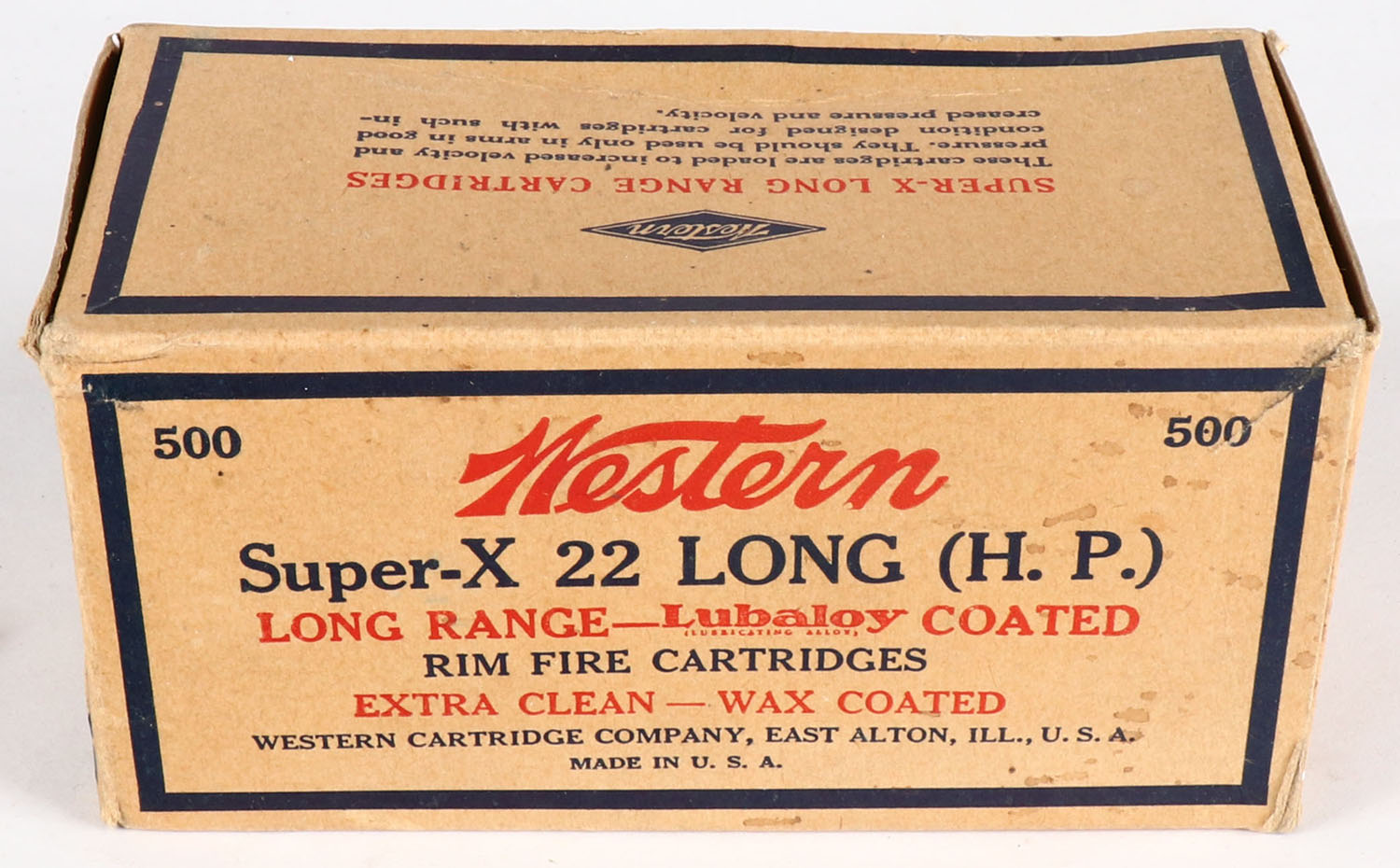 Western, Super-X, .22 Long Hollow Point, Extra Clean Wax Coated, Empty, 1pc. Buff blue & red brick, brick is solid with excellent color, very minor staining, some edge & corner wear, end flaps are solid. Grade: Very Good + - Value: 8 to 40