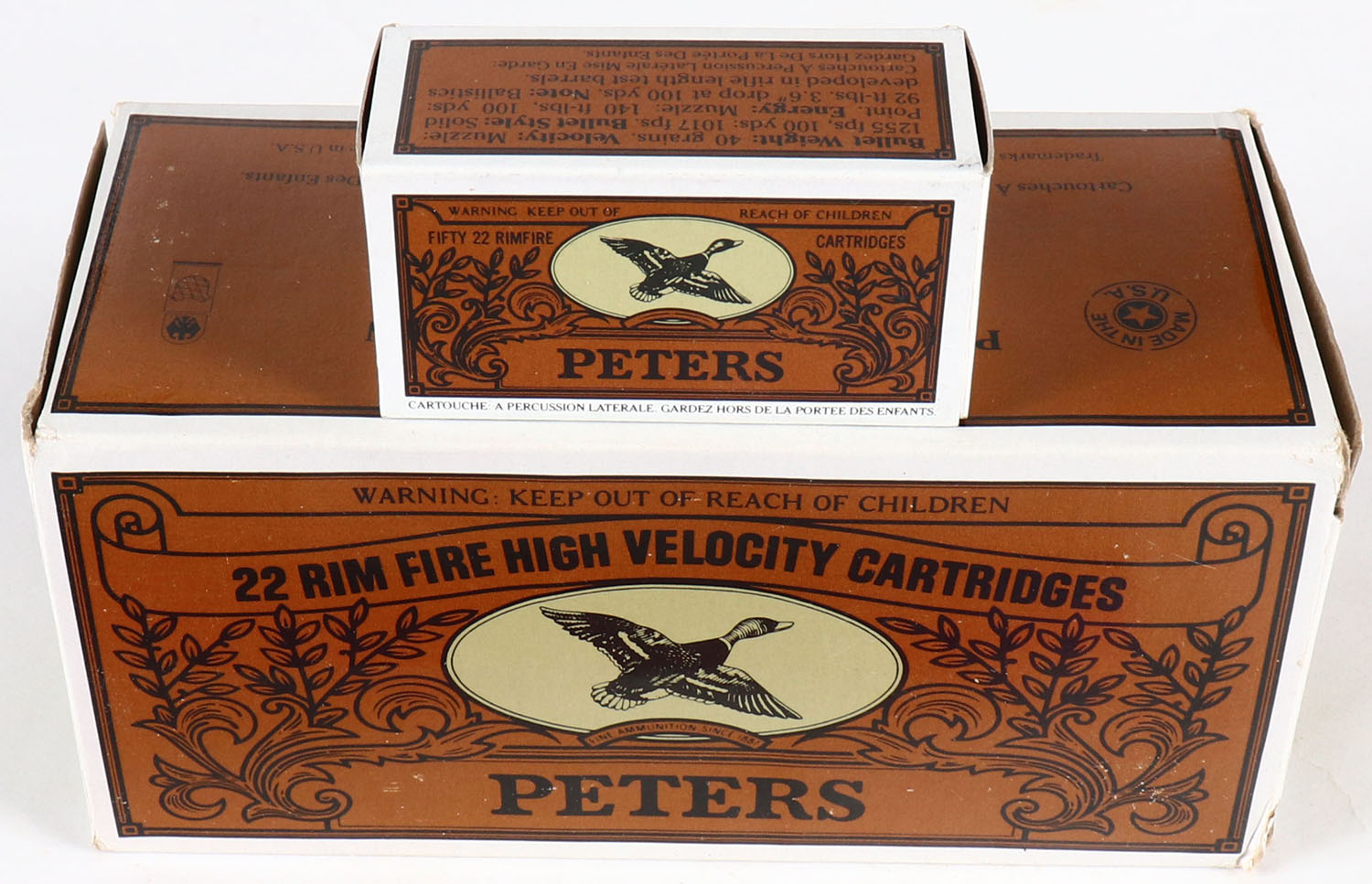 Peters, Rim Fire High Velocity Cartridges, .22 Long Rifle, High Velocity, Solid Point, Full, brown & green brick, brick is solid with minty color, very minor shelf & corner wear, edges are crisp, end flaps are solid, inside boxes are mint. Grade: Excellent ++ - Value: 30 to 90