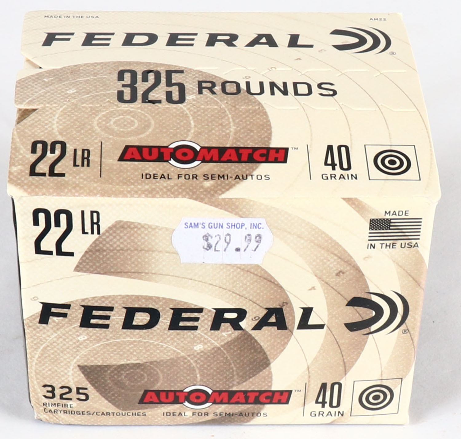 Federal, AutoMatch, .22 Long Rifle, Ideal for Semi-Autos, 40 Grain Solid, 1200 FPS, FULL & SEALED 325 rds. 1pc. Tan & black bulk box, box is solid with minty color, very minor corner wear, edges are crisp. Grade: Excellent ++ - Value: 10 to 50