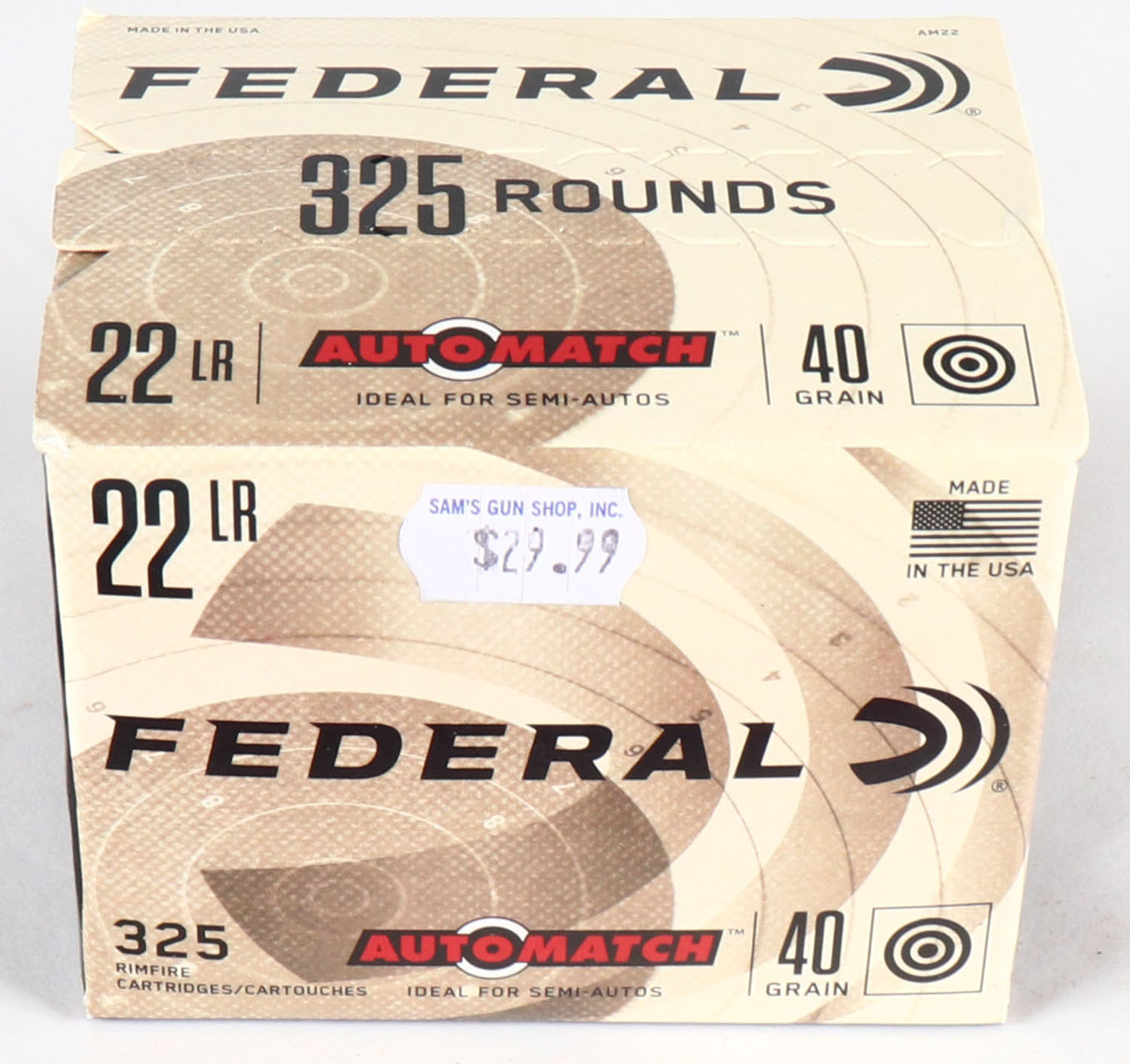 Federal, AutoMatch, .22 Long Rifle, Ideal for Semi-Autos, 40 Grain Solid, 1200 FPS, FULL & SEALED 325 rds. 1pc. Tan & black bulk box, box is solid with minty color, very minor corner wear, edges are crisp. Grade: Excellent ++ - Value: 10 to 50