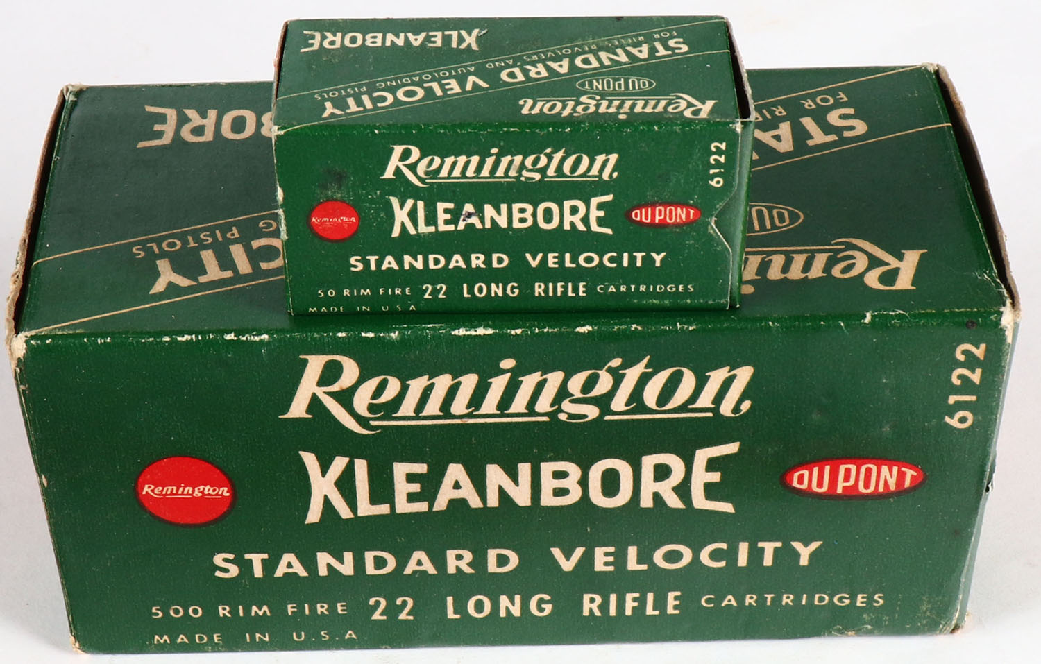 Remington, Kleanbore Standard Velocity, .22 Long Rifle, Full, 450rds. (1 box empty), 1pc. Green white & red brick, brick is solid with excellent color, some corner wear, minor edge wear, end flaps are solid, inside boxes are minty. Grade: Excellent + - Value: 20 to 80