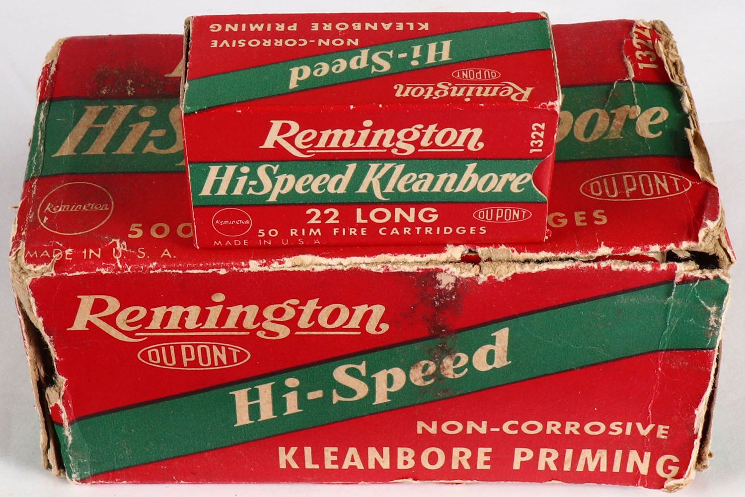Remington, Hi-Speed Kleanbore, .22 Long, Full, 1pc. Red green & white brick, complete seam split to top back edge, several partial seam splits, good color, some age soiling, shelf wear, edge wear, corner wear, inside boxes are minty. Grade: Poor - Value: 80 to 240