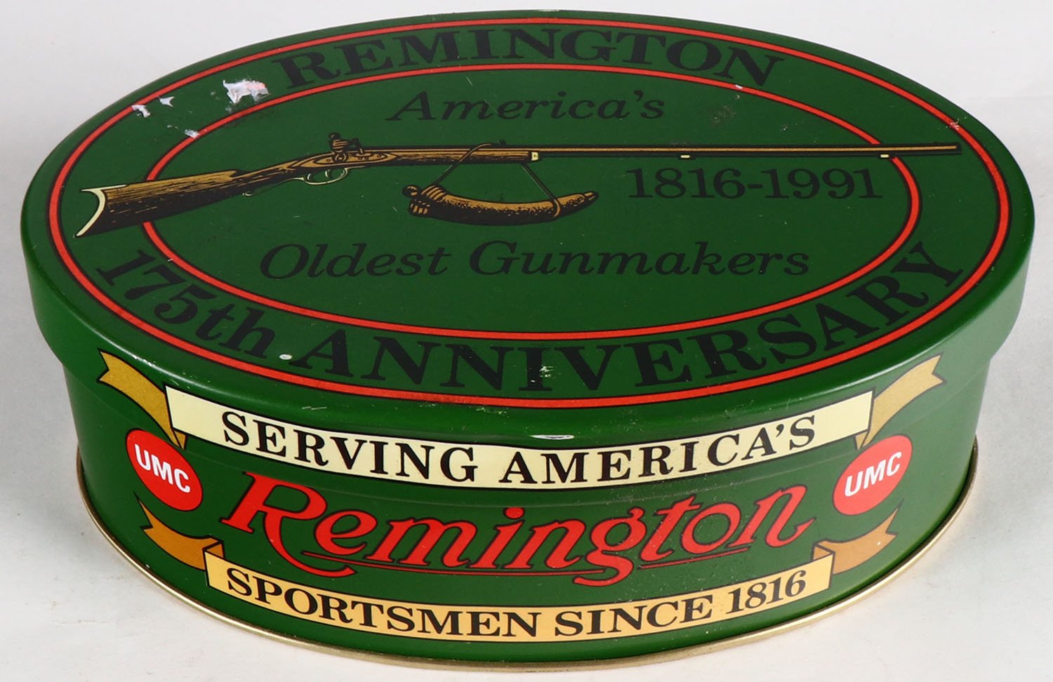 Remington, .22 Long Rifle, High Velocity, 175th Anniversary Collectors tin without box, Full, 325rds. 2pc. Green tin, tin is near mint with minty color, only very minor edge wear around lid, ammo is minty. Grade: Excellent ++ - Value: 10 to 50