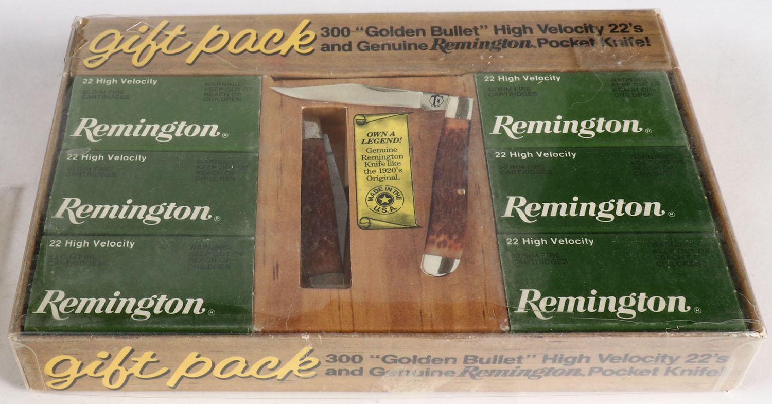 Remington, Gift Pack, 300 ''Golden Bullet'' High Velocity 22's and Genuine Remington Pocket Knife, .22 Long Rifle, Full, 6 boxes, 2pc. Gift box with clear cover, box is solid with minty color, clear cover is cloudy & has some tears on top, knife & inside boxes are excellent. Grade: Excellent - Value: 20 to 60