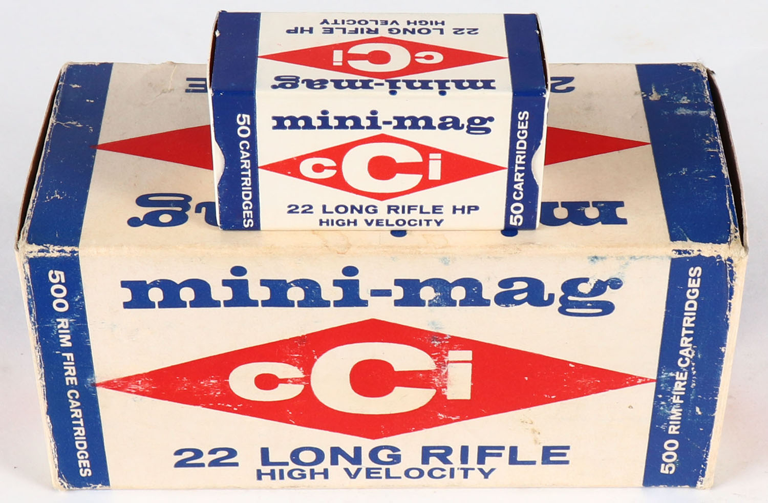 CCi, mini-mag, .22 Long Rifle, High Velocity, Full, 500rds. 1pc. White blue & red brick, brick is solid with excellent color, very minor age soiling, minor shelf & edge wear, some corner wear, end flaps are solid, (9) boxes are minty, (1) box has a corner ding but is otherwise excellent. Grade: Excellent - Value: 30 to 90
