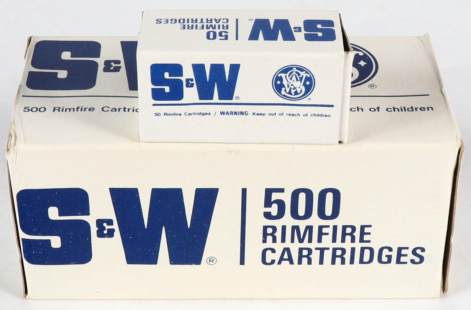 Smith & Wesson, Standard Velocity, .22 Long Rifle, Full, 500rds. 1pc. White & blue brick, brick is near mint with minty color, only very minor corner wear, edges are crisp, end flaps are solid, inside boxes are mint. Grade: Excellent ++ - Value: 80 to 240