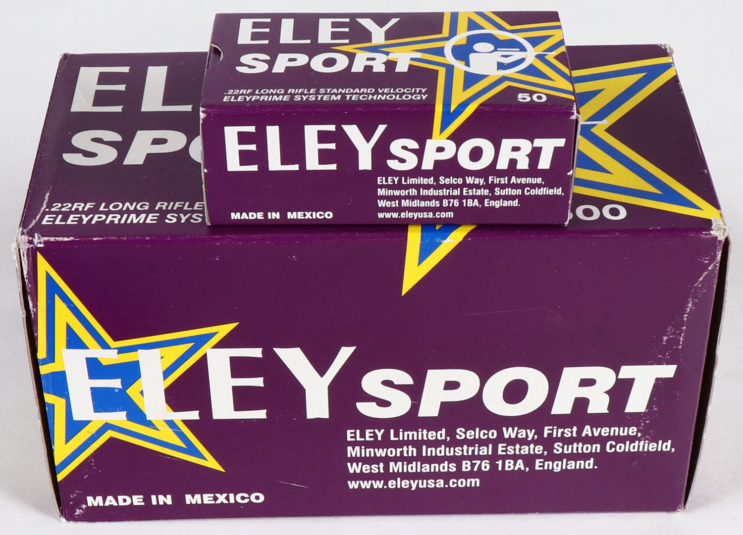 Eley, Sport, .22 Long Rifle, Standard Velocity, 40 Gr., Full, 500rds. 1pc. Purple blue & yellow brick, brick is near mint with minty color, only minor corner wear, edges are crisp, end flaps are solid, inside boxes are mint. Grade: Excellent ++ - Value: 30 to 90