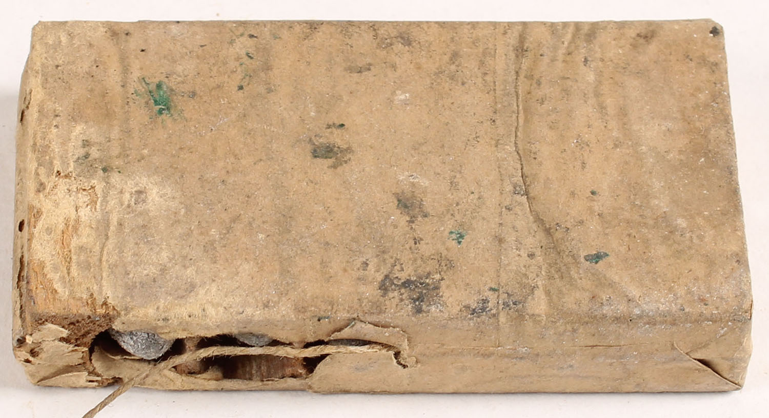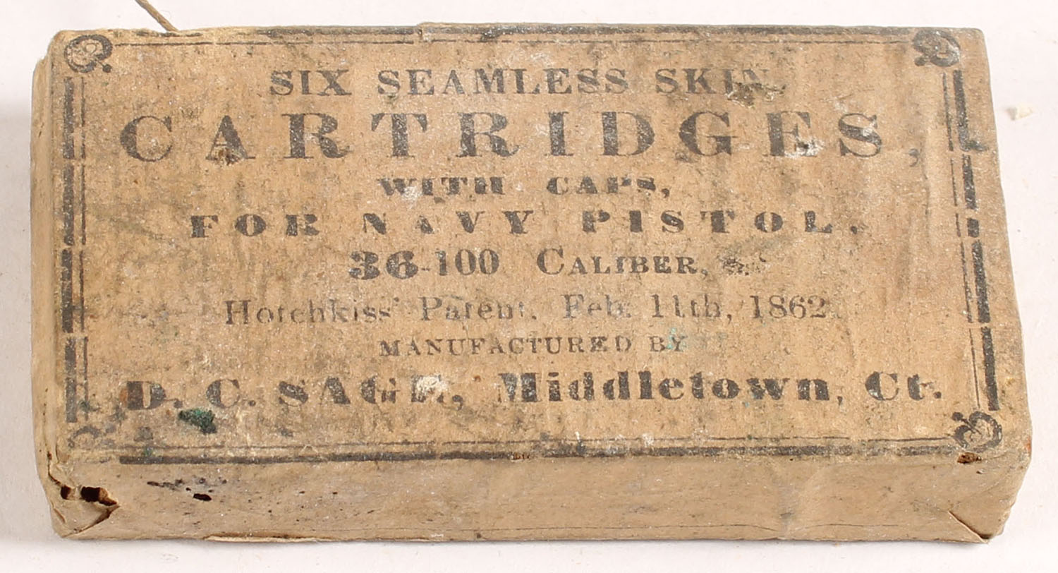 D.C. Sage, Six Seamless Skin Cartridges, 36-100 Caliber With Caps for Navy Pistol, Full & Mostly Sealed, 1pc. Buff packet with black printing, string intact. Packet is solid with good color, age soiling, minor shelf wear, wrapping label is 95% intact, small tear on back side that is missing, exposing 2 bullet tips, which appear to be good to very good. Grade: Good ++ - Value: 200 to 600