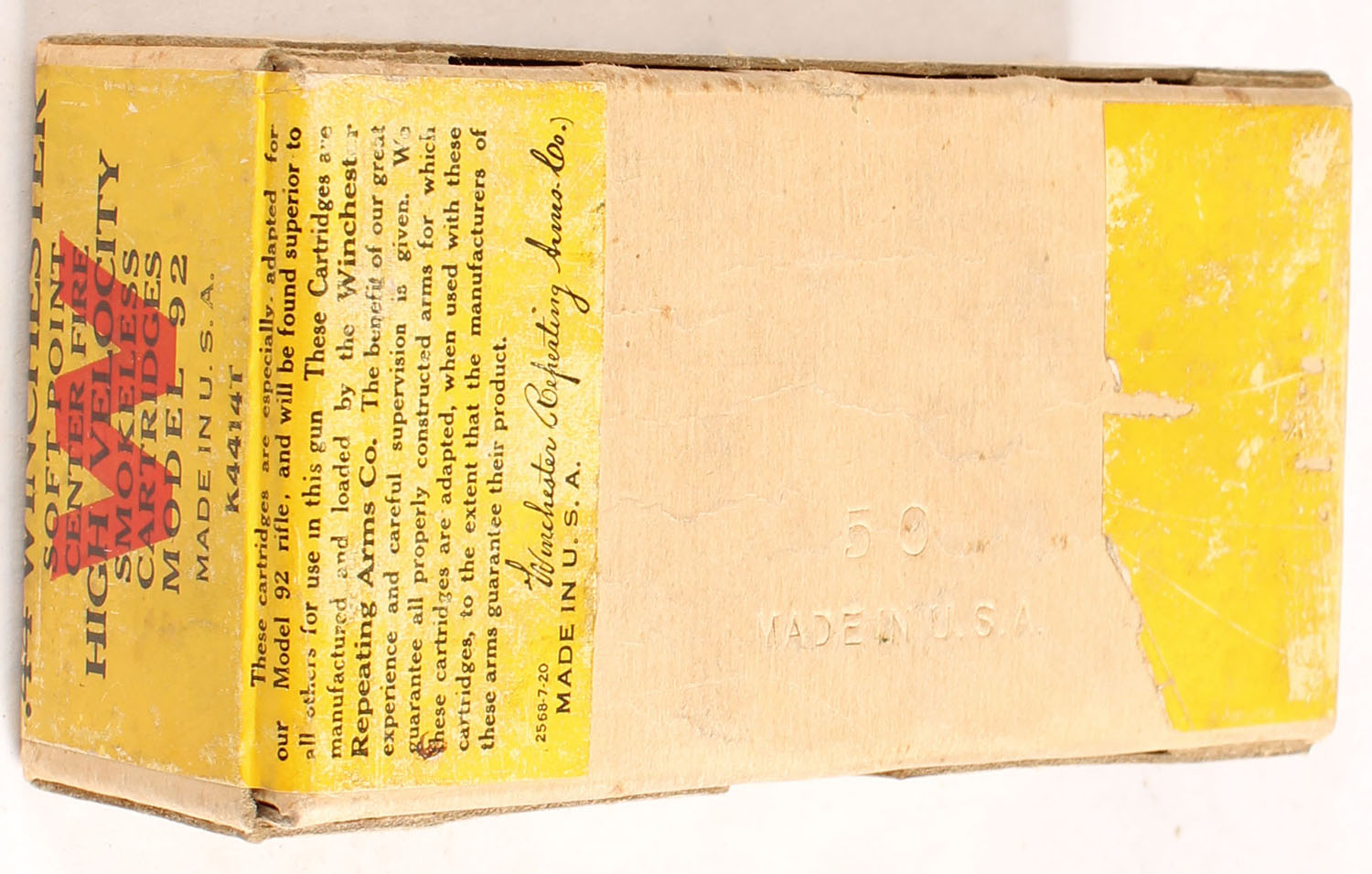 Winchester, High Velocity Smokeless Cartridges, .44 Winchester Soft Point, FULL & SEALED, 2pc. Buff box with yellow wraparound label & white sight adjustment over-label, box is solid with very good color, some age soiling & staining, corners are mostly sharp, edges are crisp, labels are intact. Grade: Very Good ++ - Value: 300 to 900