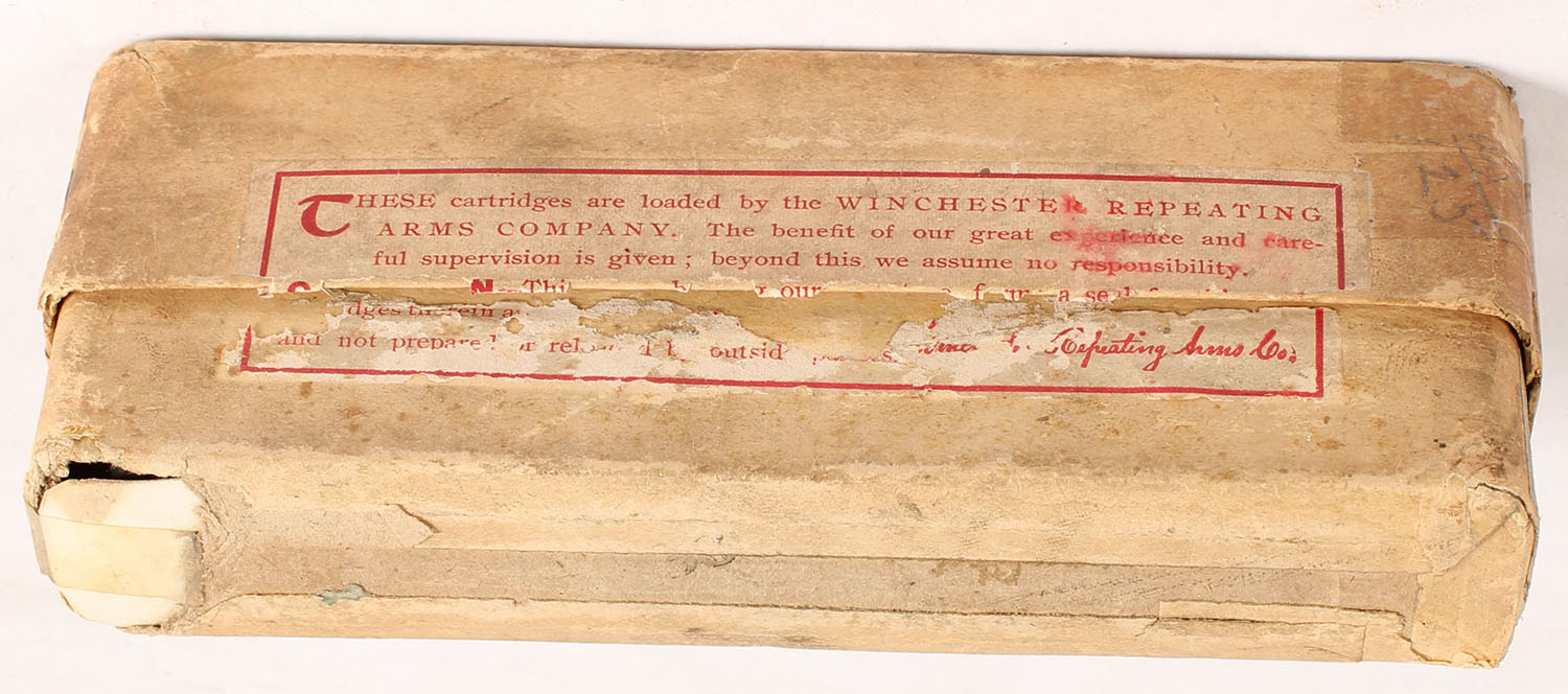 Winchester, Center Fire Cartridges, .45-75 Winchester, Full of mixed WRA H/S, 2pc. Buff box with green labels, box is solid with very good color, some age soiling & shelf wear, edge & corner wear, tape on left end of lid, labels are intact, ammo is excellent. Grade: Very Good - Value: 100 to 400