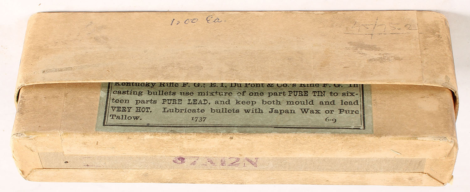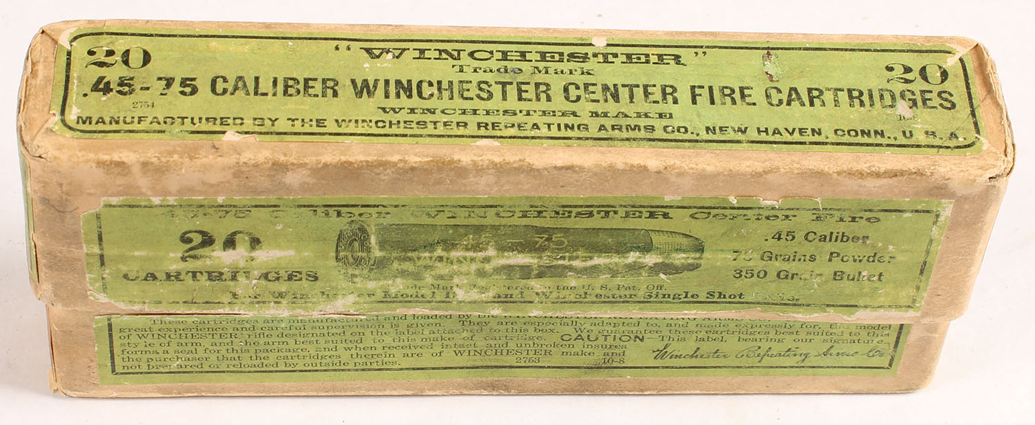 Winchester, Center Fire Cartridges, .45-75 Winchester, 350 Grain Bullet, Partial 10rds. Of mixed WRA H/S, 2pc. Buff box with green labels, box is solid with very good color, shelf wear, corner wear, some edge wear, labels are intact, ammo is excellent. Grade: Very Good - Value: 50 to 200