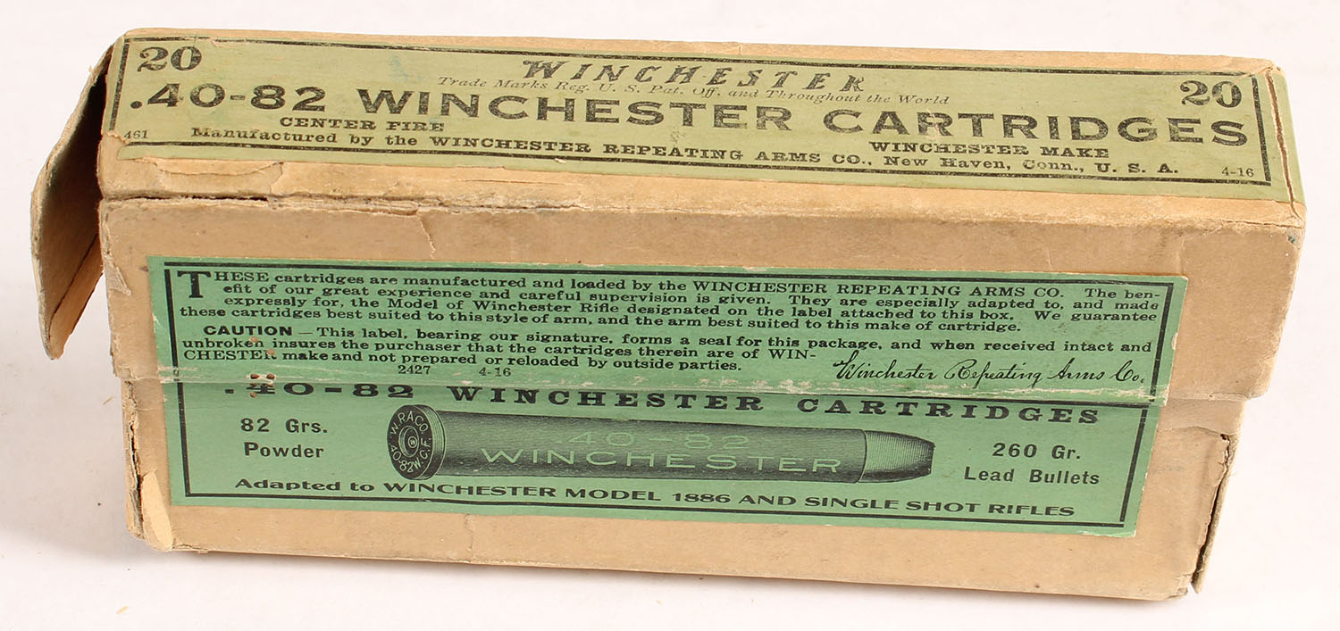 Winchester, Center Fire Cartridges, .40-82 Winchester, 260 Gr. Lead Bullets, Full, 2pc. Buff box with green labels, box is solid with excellent color, very minor age soiling & color fading on top, multiple full & partial seam splits to left end of lid, partial seam split to front edge of lid, some edge & corner wear, labels are intact, front label is still sealed, ammo is excellent. Grade: Very Good - Value: 150 to 450