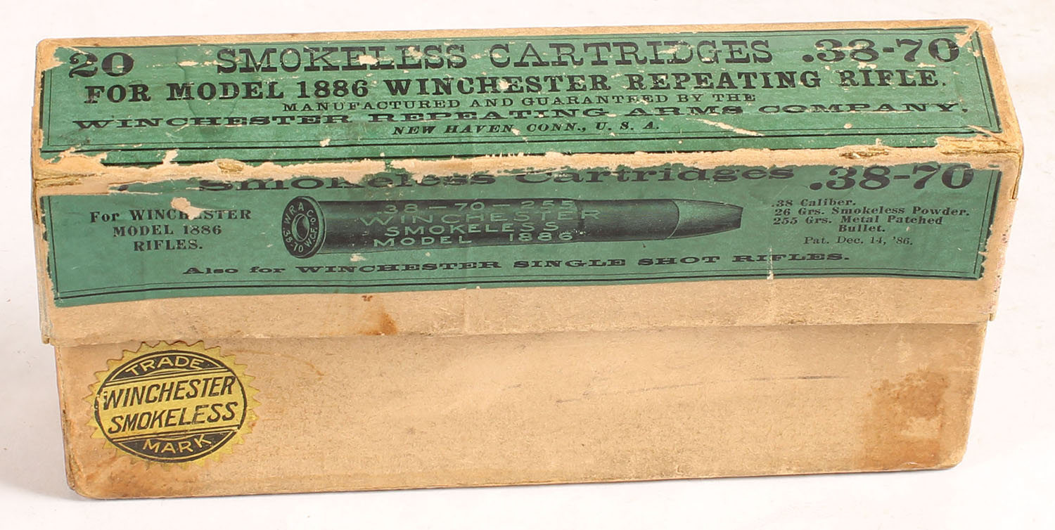 Winchester, Smokeless Cartridges, .38-70 Winchester, 255 Grs. Metal Patched Bullet, Full, 1pc. Buff box with green label, box is solid with very good color, very minor age soiling, some shelf wear, & staining, some edge & corner wear, label is intact, ammo is excellent. Grade: Very Good ++ - Value: 100 to 400