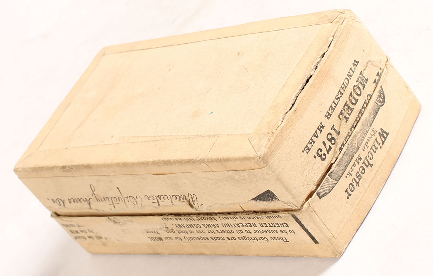 Winchester, Cartridges for Model 1873, .44 Winchester, Full of mixed WRA H/S ammo, 1pc. Buff box with green top & buff side sealing labels, box is solid with very good color, some age soiling & staining, some shelf wear, partial seam split top right edge, some edge & corner wear, labels are intact, ammo is good to very good. Grade: Good ++ - Value: 80 to 240