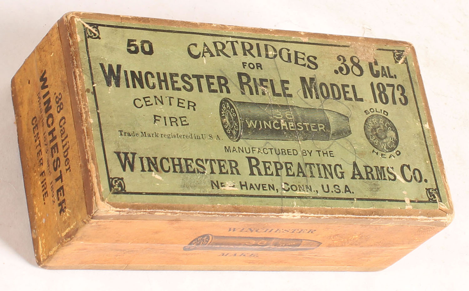 Winchester, .38 Winchester Center Fire, Solid Head, FULL & SEALED, 2pc. Buff box with green top & orange side sealing labels, box is solid with very good color, age soiling, some shelf wear, minor edge & corner wear, top has been written on, labels are intact. Grade: Very Good - Value: 100 to 300