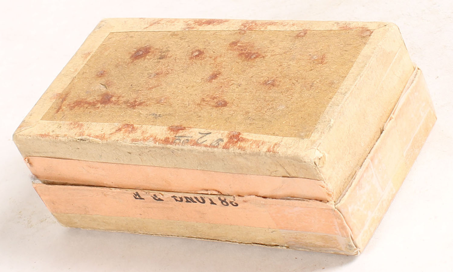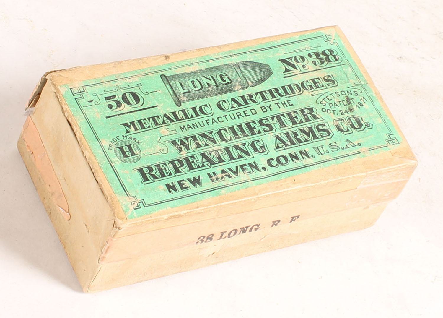 Winchester, Metallic Cartridges, .38 Long Rim Fire, Full, 2pc. Buff box with green top & salmon side sealing labels, left end of lid is missing, very good color, shelf wear, tape on all seams of lid, some edge & corner wear, side sealing label is 50% intact, ammo is good. Grade: Good - Value: 30 to 90