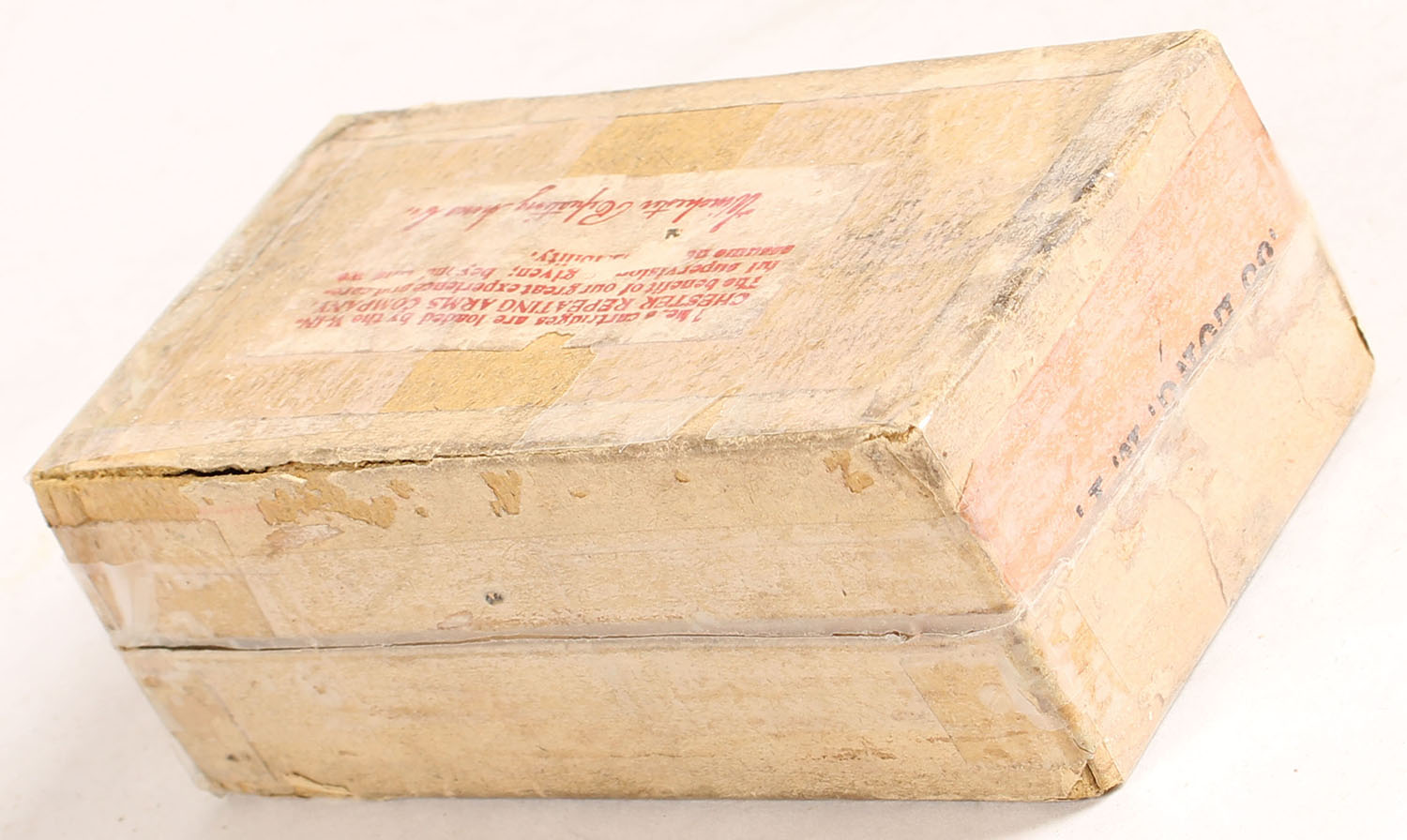 Winchester, Rifle Cartridges, .38 Long Rim Fire, Repacked, Full, 2pc. Buff box with green top & orange side sealing labels, ''Repacked'' over-stamp on top, box is almost completely covered in tape, very good color, some age soiling, shelf wear, chipping to labels, some edge & corner wear, side sealing label is 50% intact, ammo is excellent. Grade: Good - Value: 20 to 60