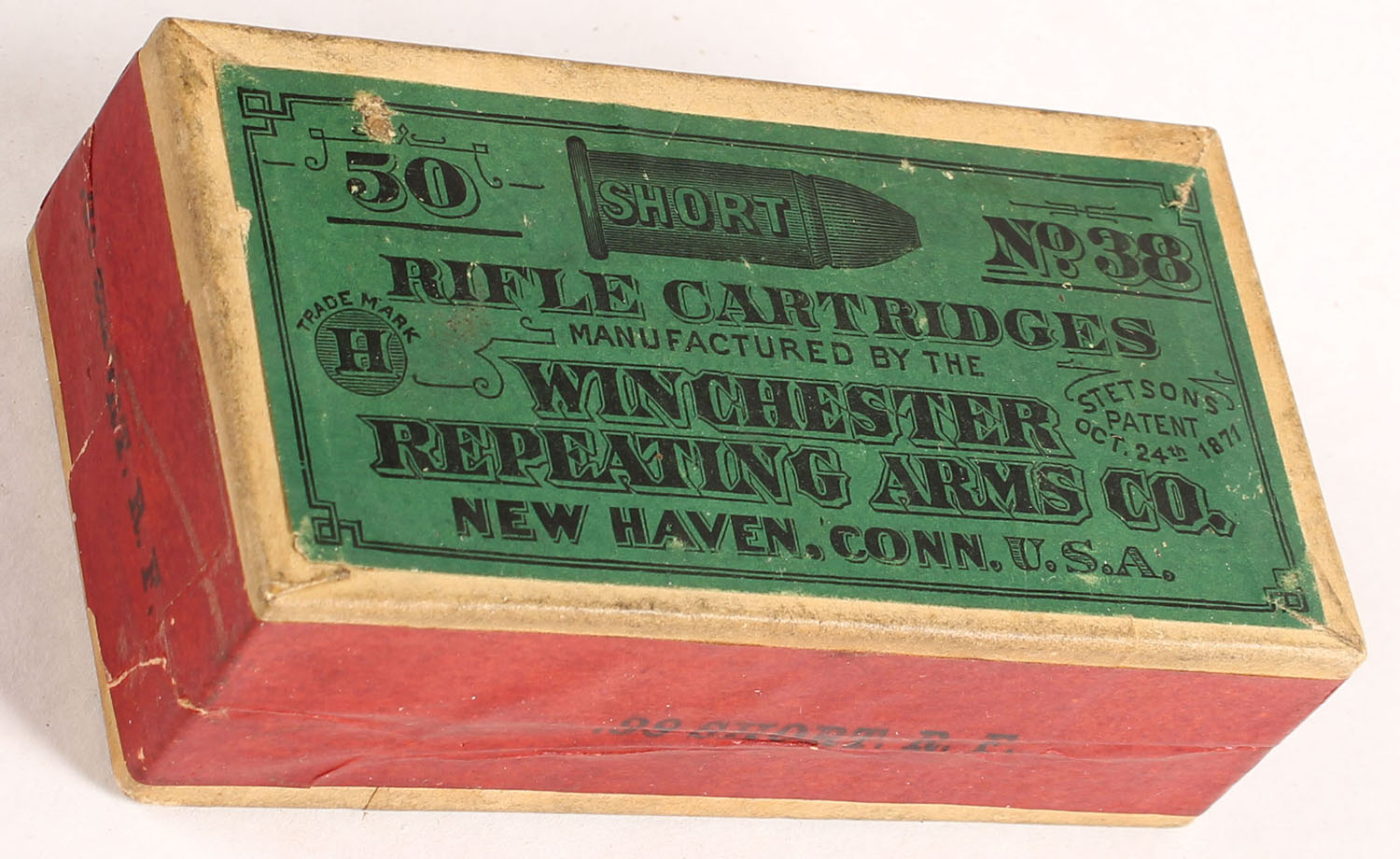 Winchester, Rifle Cartridges, .38 Short Rim Fire, FULL & SEALED, 2pc. Buff box with green top & red side sealing labels, box is solid with excellent color, minor age soiling, corners are mostly sharp, edges are mostly crisp, labels are intact. Grade: Excellent + - Value: 50 to 200