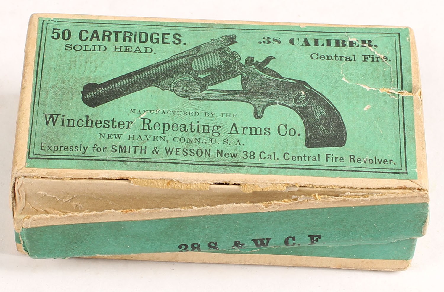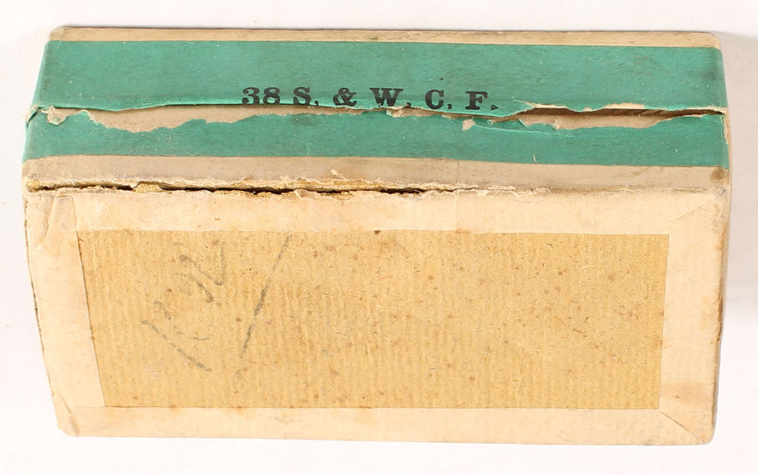 Winchester, Solid Head Central Fire, .38 Smith & Wesson, Full, 2pc. Buff box with green top & side sealing labels, seam split to top front edge, vertical seam split to front left corner, very good to excellent color, some age soiling, some edge & corner wear, side sealing label is 95% intact, ammo is good. Grade: Good ++ - Value: 20 to 60