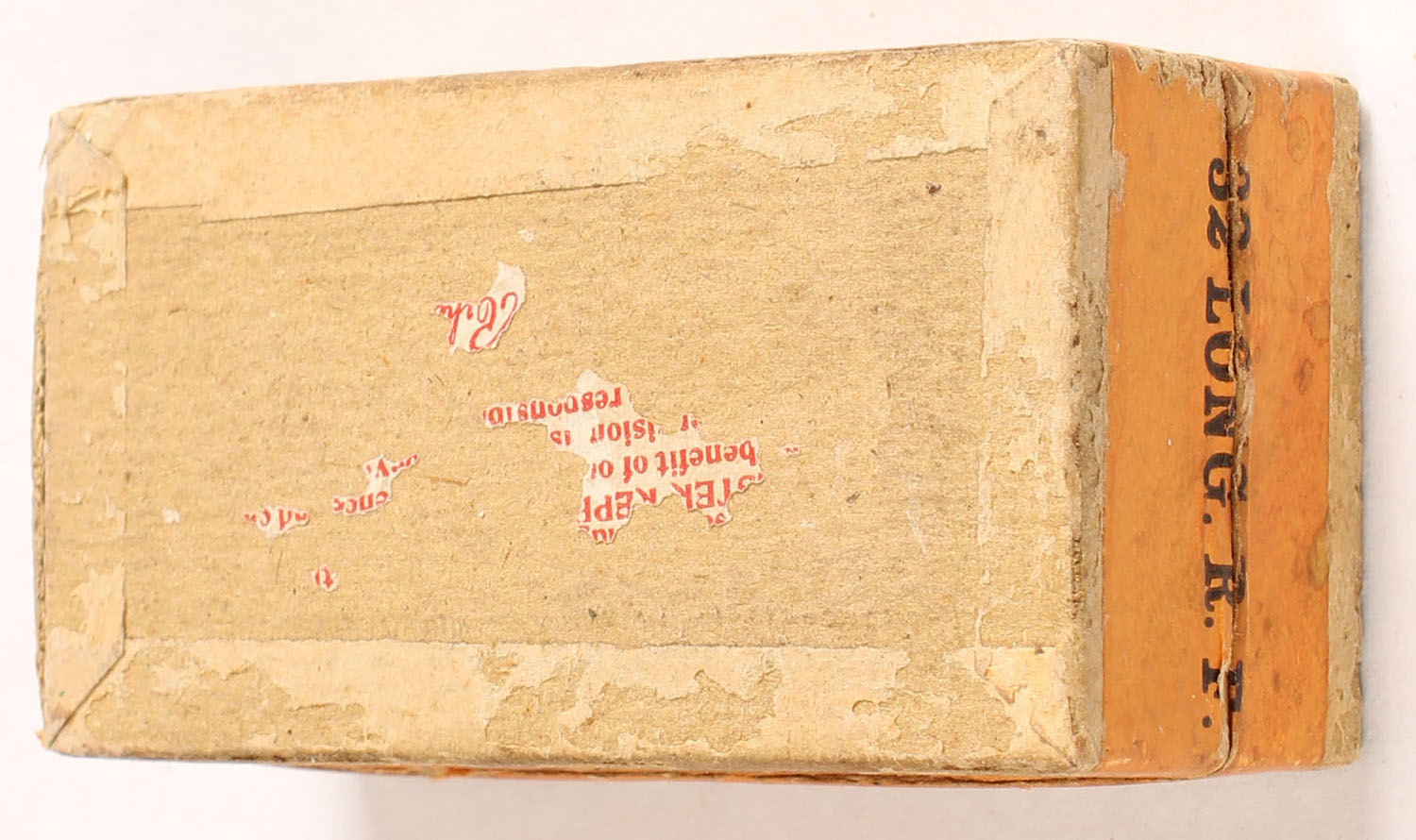 Winchester, Metallic Cartridges, .32 Long Rim Fire, Full, 2pc. Buff box with green top & orange side sealing labels, box is solid with good to very good color, some shelf wear & staining, seam split to top left edge, edge & corner wear, labels are intact, ammo is very good. Grade: Very Good - Value: 20 to 80