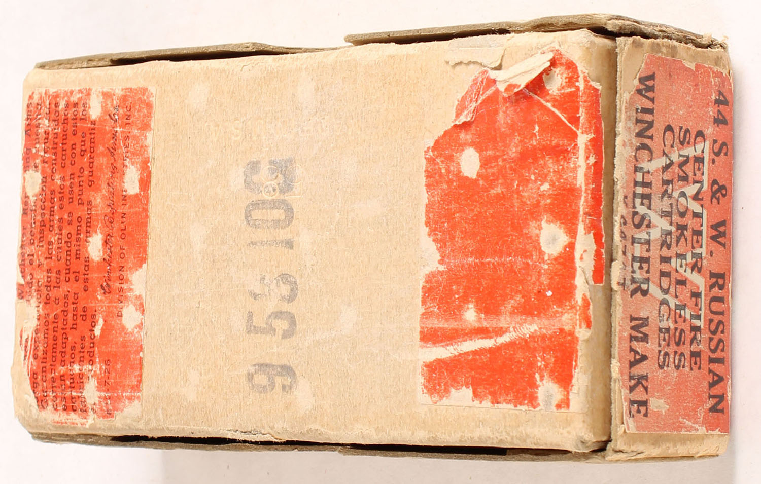 Winchester, Smokeless Cartridges, .44 Smith & Wesson Russian, 246 Grain Lead Bullets, Partial 48rds., 2pc. Buff box with red wraparound label, box is solid with very good to excellent color, shelf wear, some corner wear, minor edge wear, label is intact, ammo is very good. Grade: Very Good - Value: 20 to 60