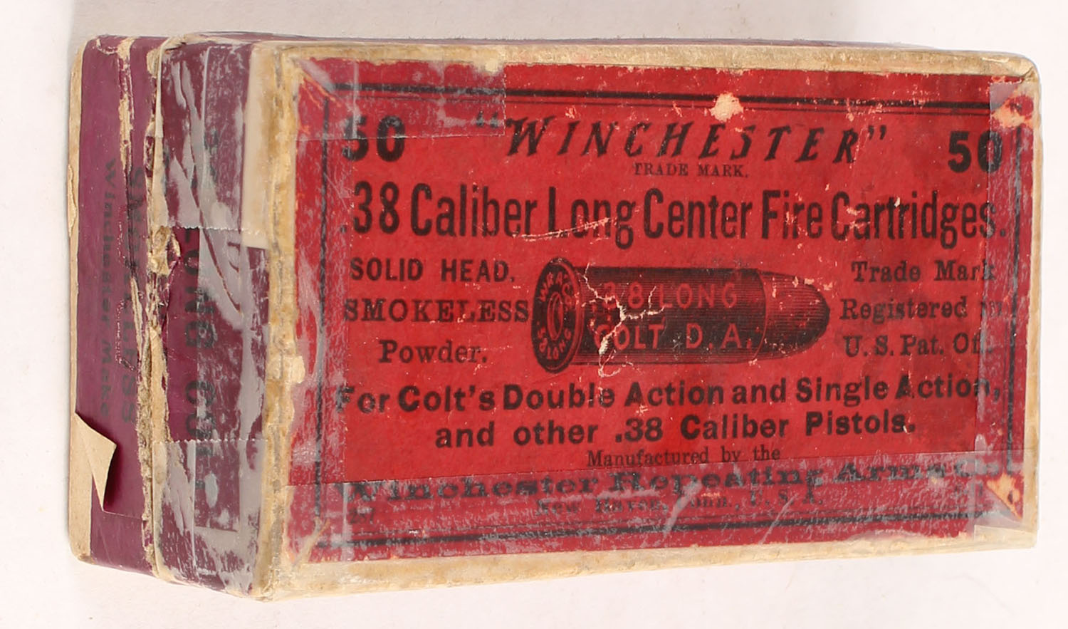 Winchester, Center Fire Cartridges, .38 Long Colt, Full, 2pc. Buff box with red top & purple side sealing labels, box is solid with very good color, minor age soiling, all lid edges are taped, some shelf wear, some edge & corner wear, labels are intact, ammo is good. Grade: Good + - Value: 30 to 90
