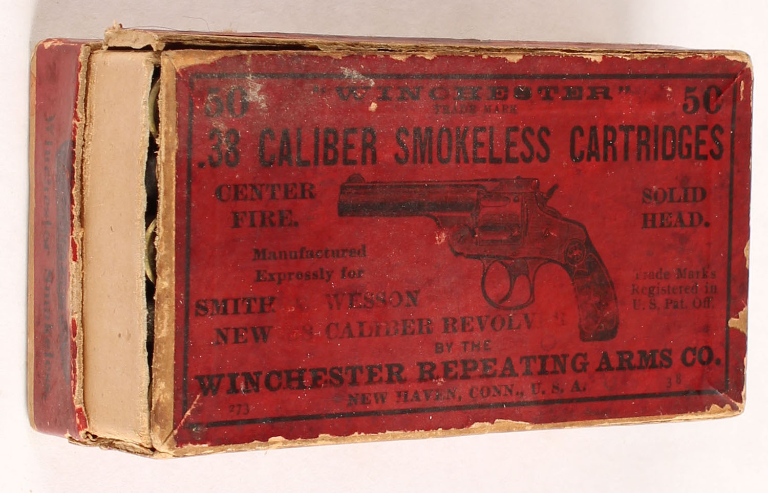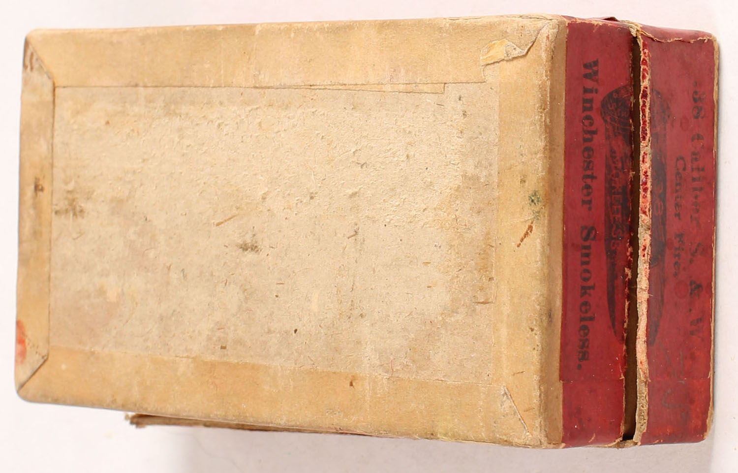 Winchester, Smokeless Cartridges, .38 Smith & Wesson, Full, 2pc. Buff box with red top & side sealing labels, left end of lid is torn off, seam split to top back edge, very good color, some age soiling, some edge & corner wear, labels are intact, ammo is very good. Grade: Very Good - Value: 10 to 50