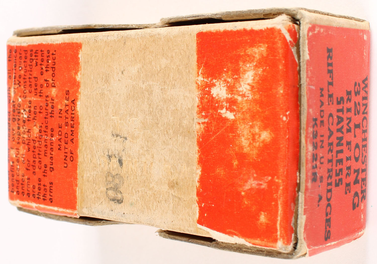 Winchester, Staynless, .32 Long Rim Fire, Full, 2pc. Buff box with red wraparound label, box is solid with very good to excellent color, some shelf wear & color fading, top has been written on, very minor edge & corner wear, label is intact, ammo is excellent. Grade: Excellent - Value: 50 to 150