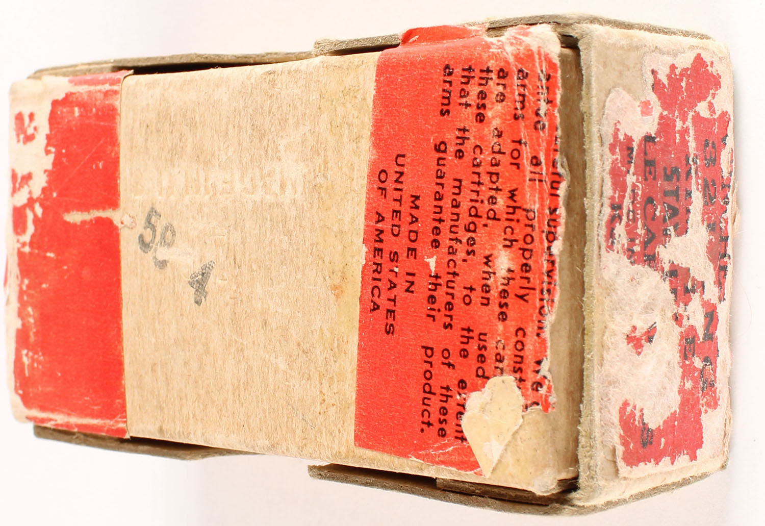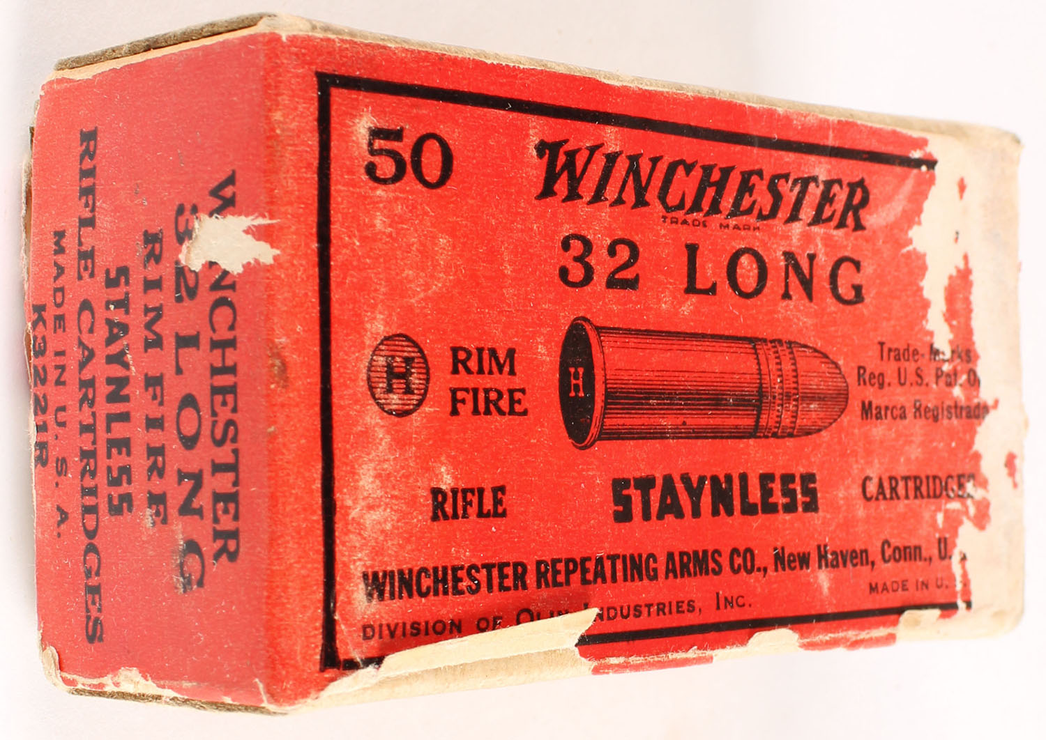 Winchester, Staynless, .32 Long Rim Fire, Partial 48rds. 2pc. Buff box with red wraparound label, box is solid with very good color, some shelf wear, scuffing to entire right end, edge & corner wear, label is 95% intact, ammo is good to very good. Grade: Very Good - Value: 30 to 90