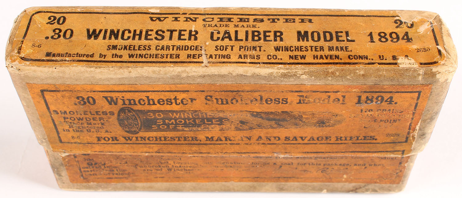 Winchester, Smokeless Cartridges, .30 Winchester (.30-30), 170 Grain Soft Point Bullet, Full of incorrect ammo, 2pc. Buff box with orange labels, box is solid with good color, age soiling, shelf wear, minor edge & corner wear, labels are intact, ammo is very good to excellent. Grade: Very Good - Value: 10 to 40