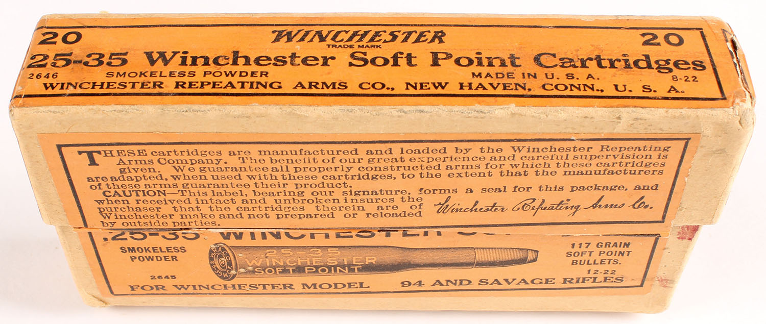 Winchester, Soft Point Cartridges, .25-35 Winchester, 117 Grain Soft Point Bullets, FULL & SEALED, 2pc. Buff box with orange labels, box is solid with very good to excellent color, minor color fading, corner wear, minor edge wear, labels are intact. Grade: Excellent - Value: 100 to 300