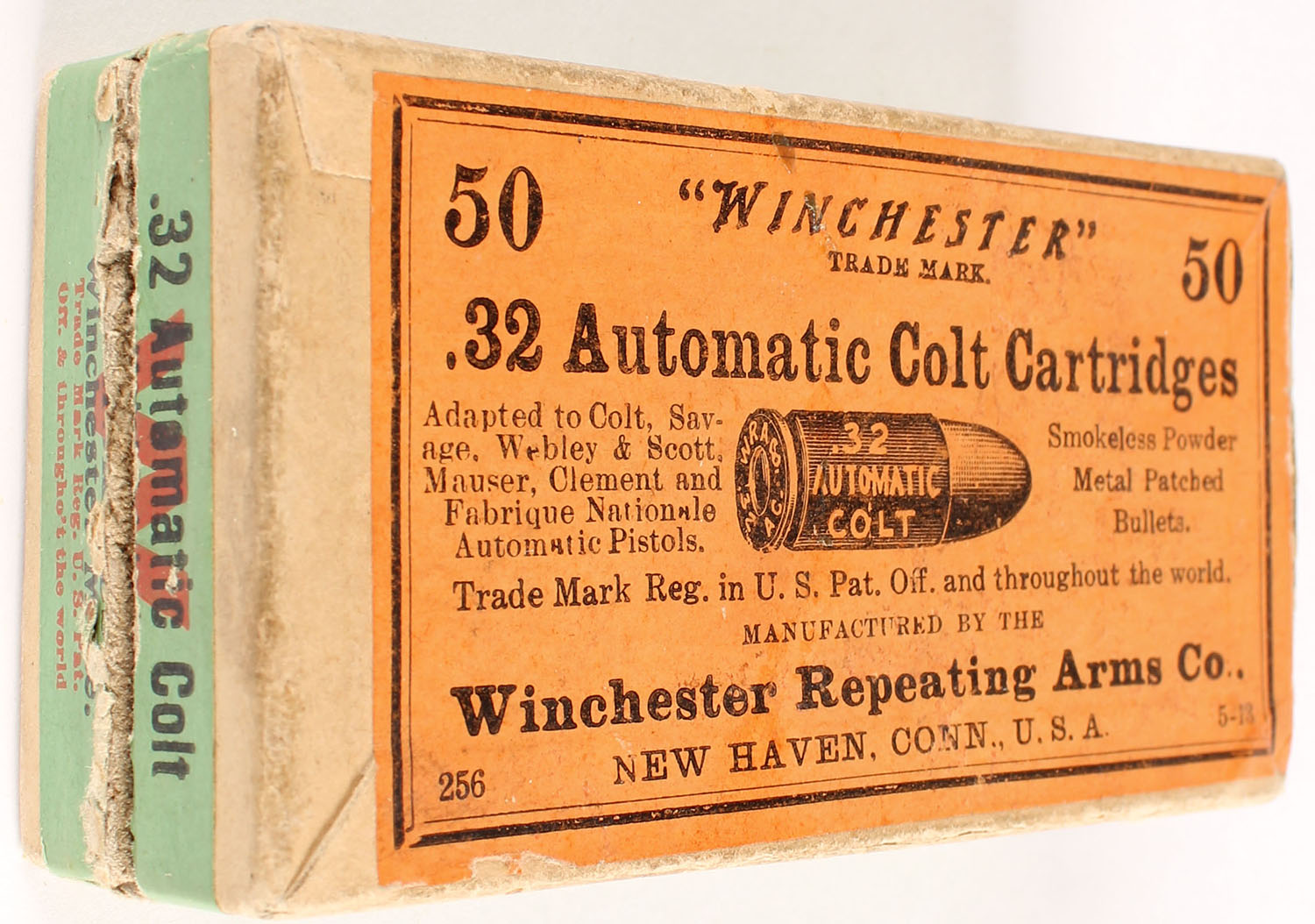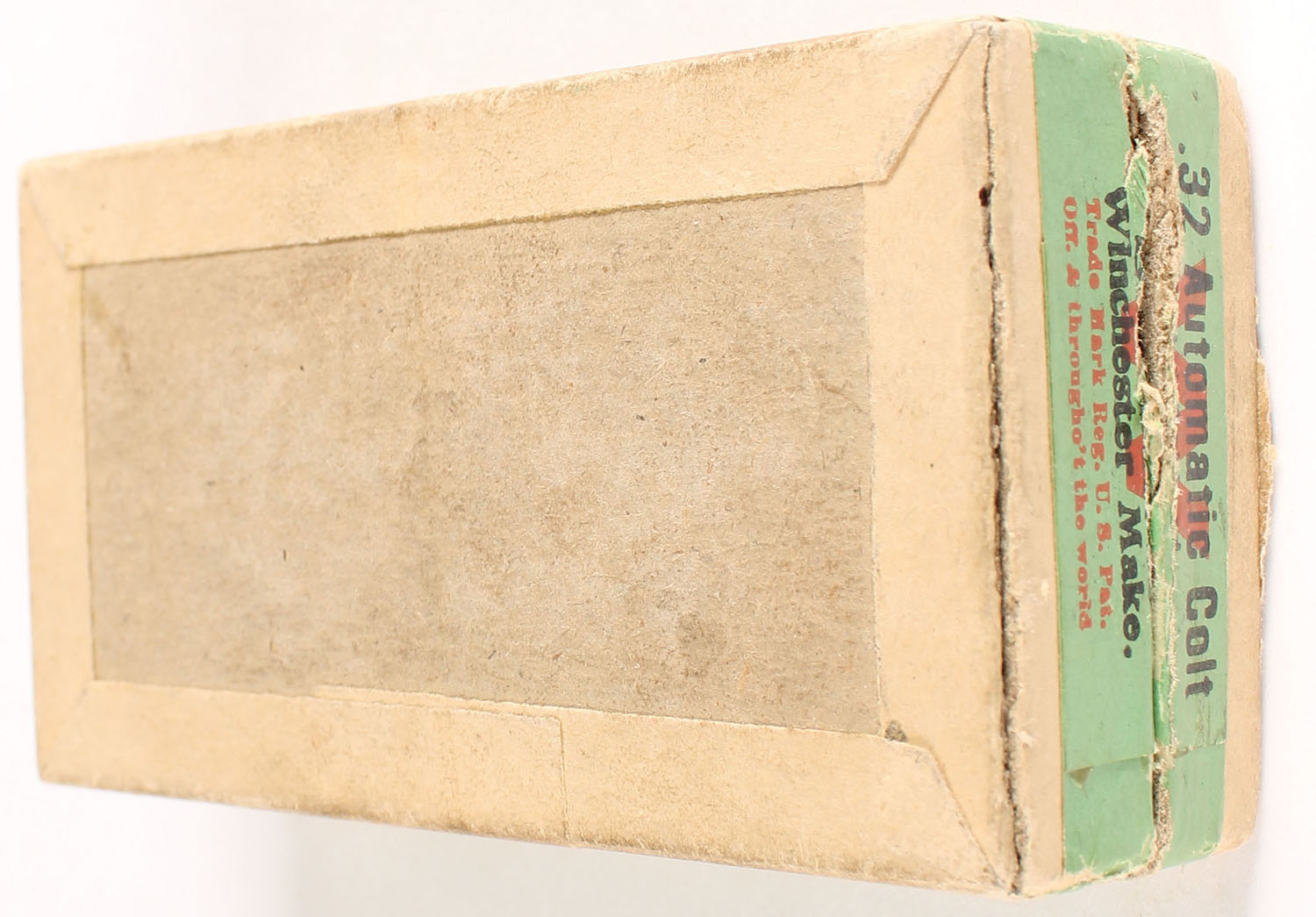 Winchester, .32 Automatic Colt, Metal Patched Bullets, Partial 24rds. 2pc. Buff box with orange top & green side sealing labels, box is solid with excellent color, very minor age soiling, some edge & corner wear, labels are intact, ammo is excellent. Grade: Excellent - Value: 10 to 40