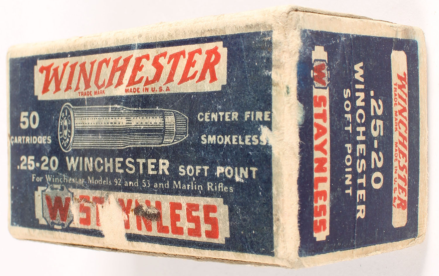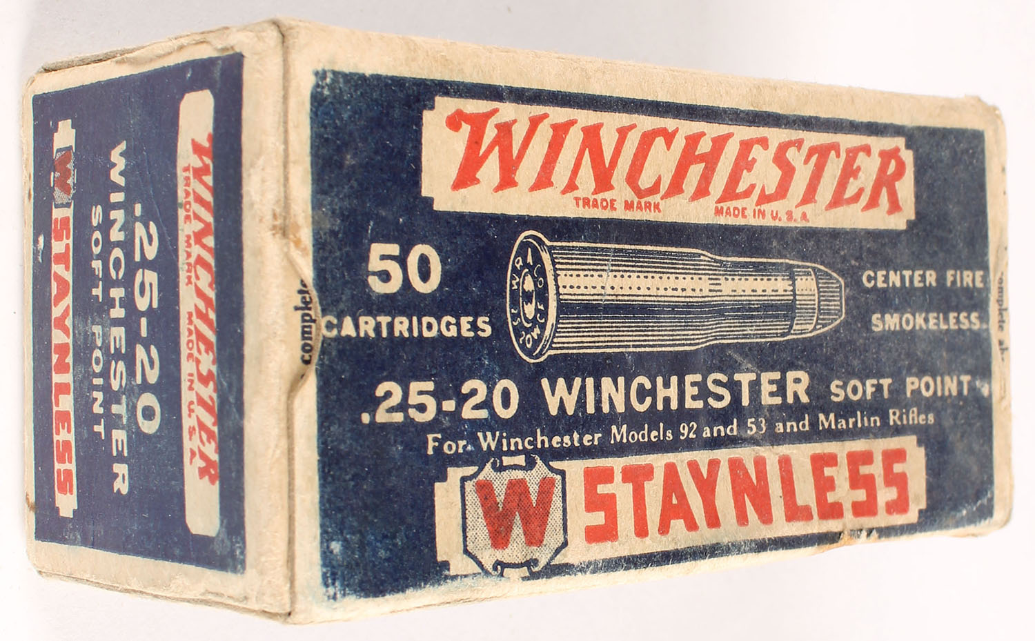 Winchester, Staynless, .25-20 Winchester, Full, 1pc. Blue white & red box, box is solid with very good color, minor age soiling, some water damage, edge & corner wear, end flaps are solid, ammo is fair. Grade: Good ++ - Value: 10 to 150