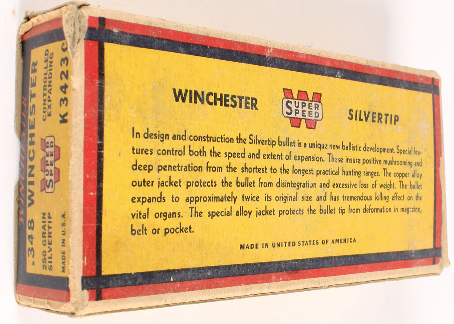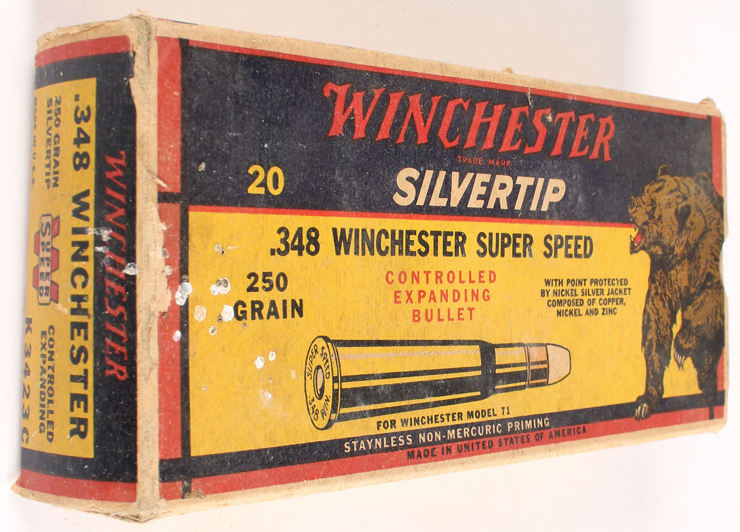 Winchester, Silvertip, .348 Winchester, 250 Grain Controlled Expanding Bullet, Full, 1pc. Yellow blue & red bear box, box is solid with very good color, some age soiling & corner wear, staining on top, very minor edge wear, end flaps are solid, ammo is fair. Grade: Very Good - Value: 40 to 120