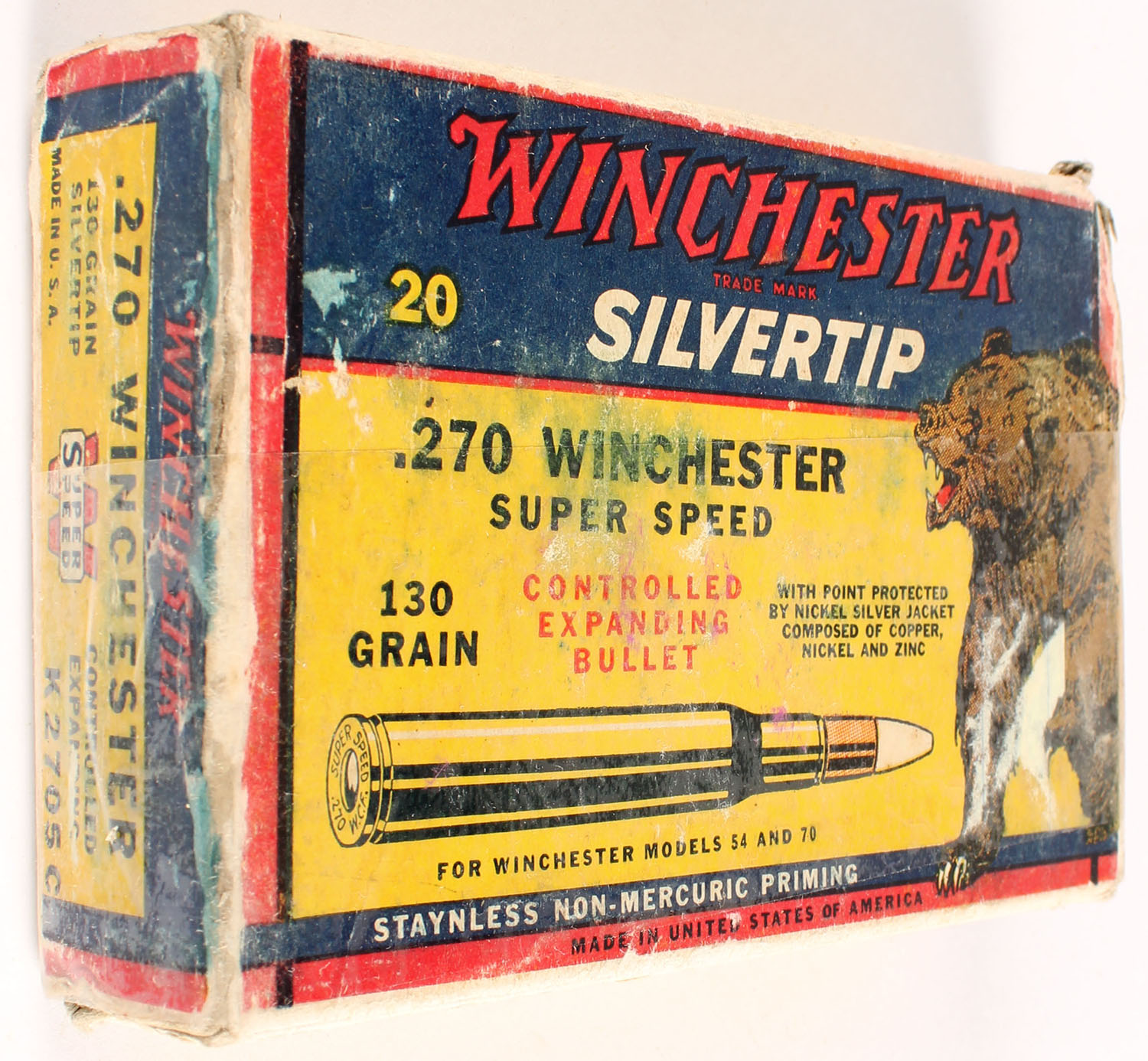 Winchester, Silvertip, .270 Winchester, 130 Grain Controlled Expanding Bullet, Full, 1pc. Yellow blue & red bear box, both end flaps are torn, very good color, some age soiling & color bleeding, tape going around box, edge & corner wear, ammo is excellent. Grade: Fair ++ - Value: 10 to 50