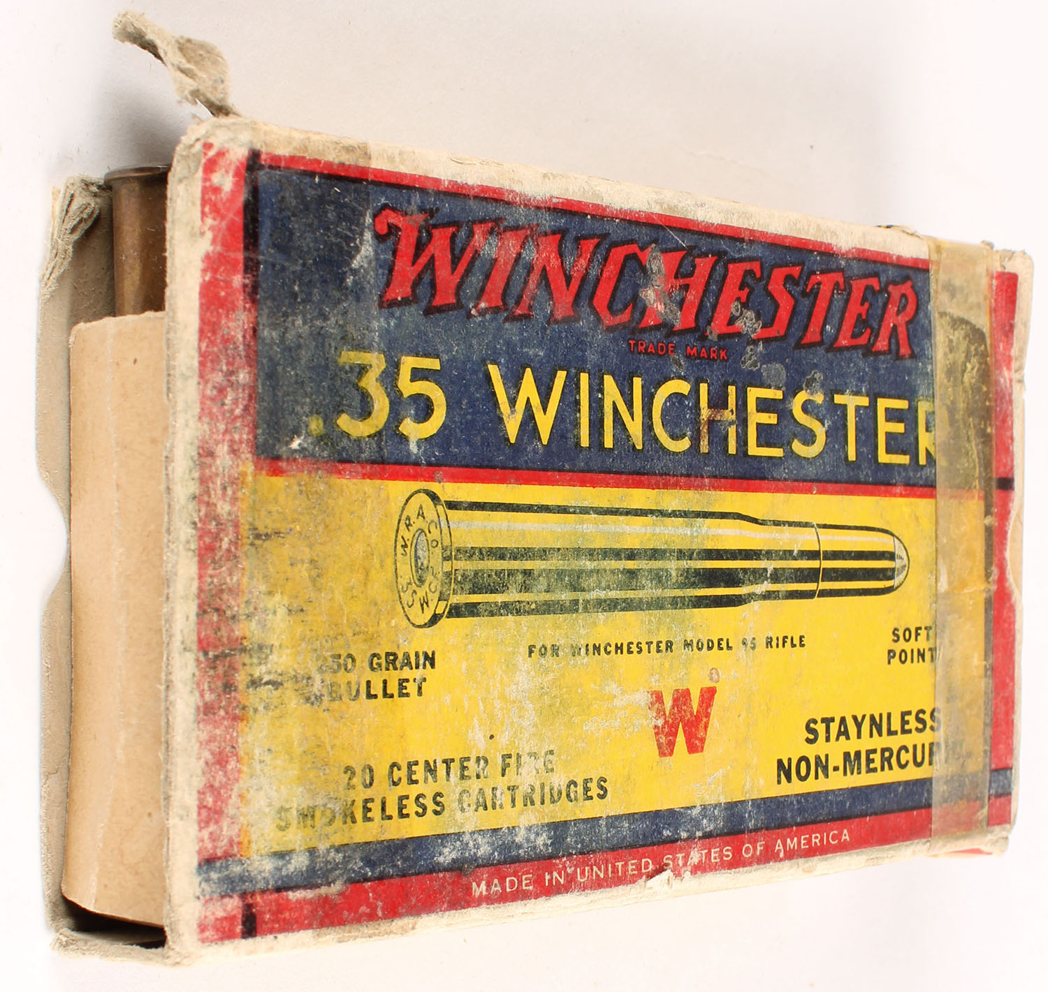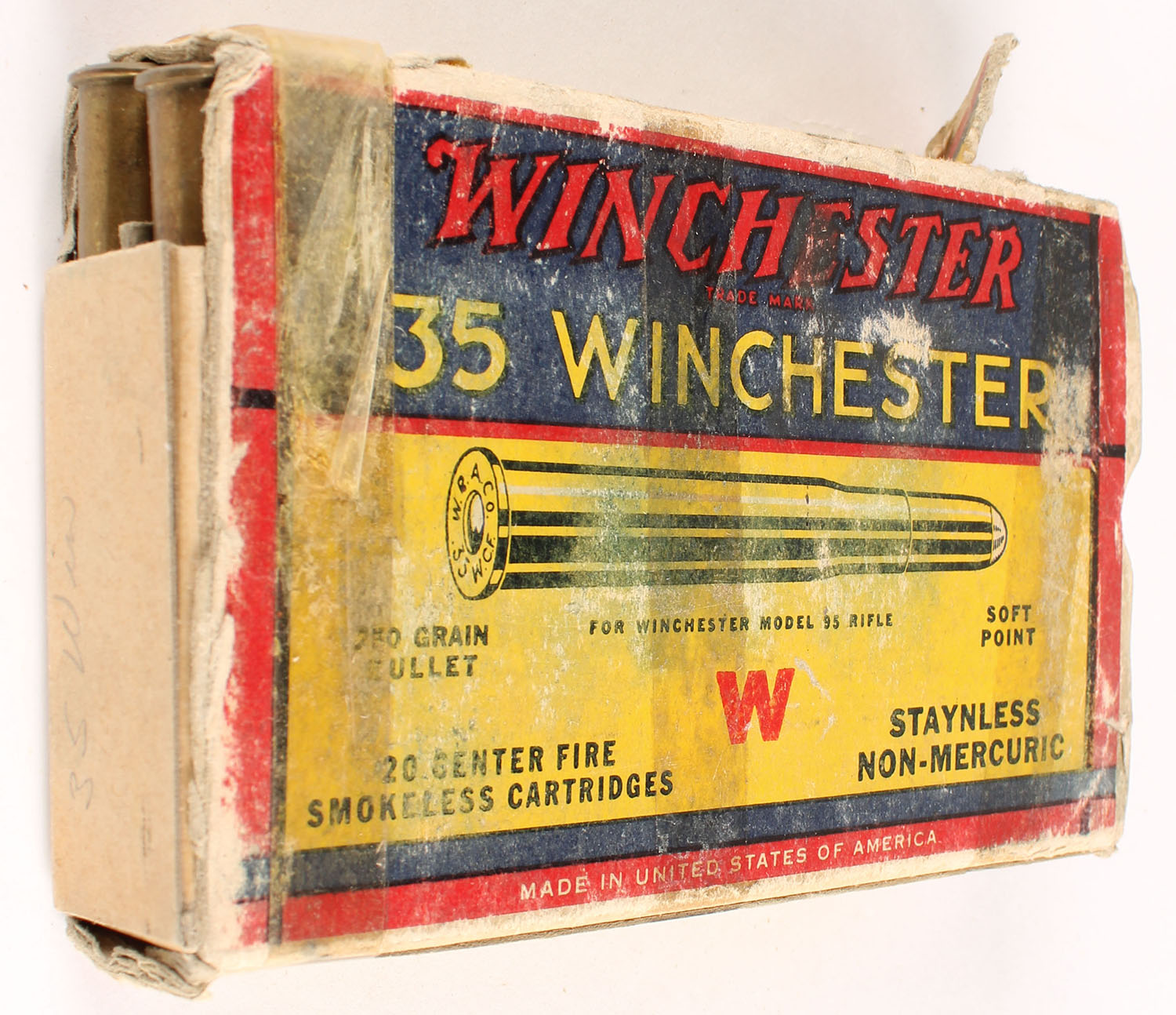 Winchester, Smokeless Cartridges, .35 Winchester, 250 Grain Soft Point Bullet, Full, 1pc. Yellow blue & red box, box is missing both end flaps, good color, age soiling, shelf wear, tape all over box, edge & corner wear, ammo is very good. Grade: Fair + - Value: 20 to 80