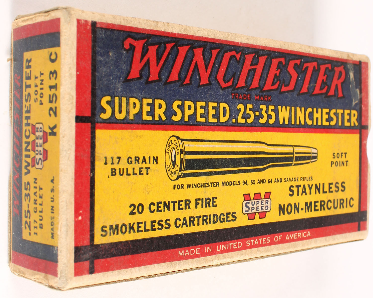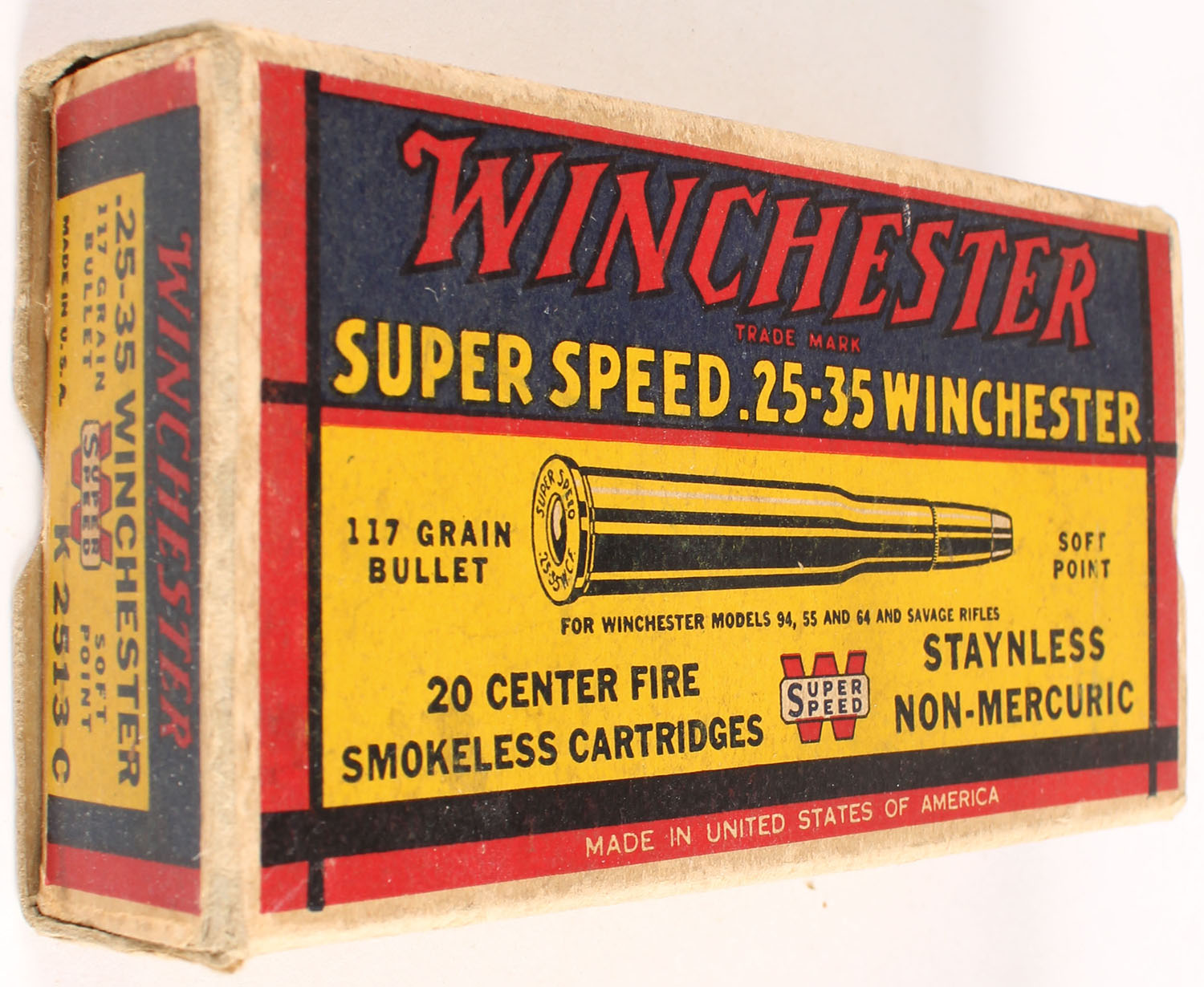 Winchester, Super Speed, .25-35 Winchester, 117 Grain Soft Point Bullet, Full, 1pc. Yellow blue & red box, box is solid with very good color, some age soiling, very minor shelf & edge wear, minor edge wear, stain on top, end flaps are solid, ammo is excellent. Grade: Excellent - Value: 40 to 120