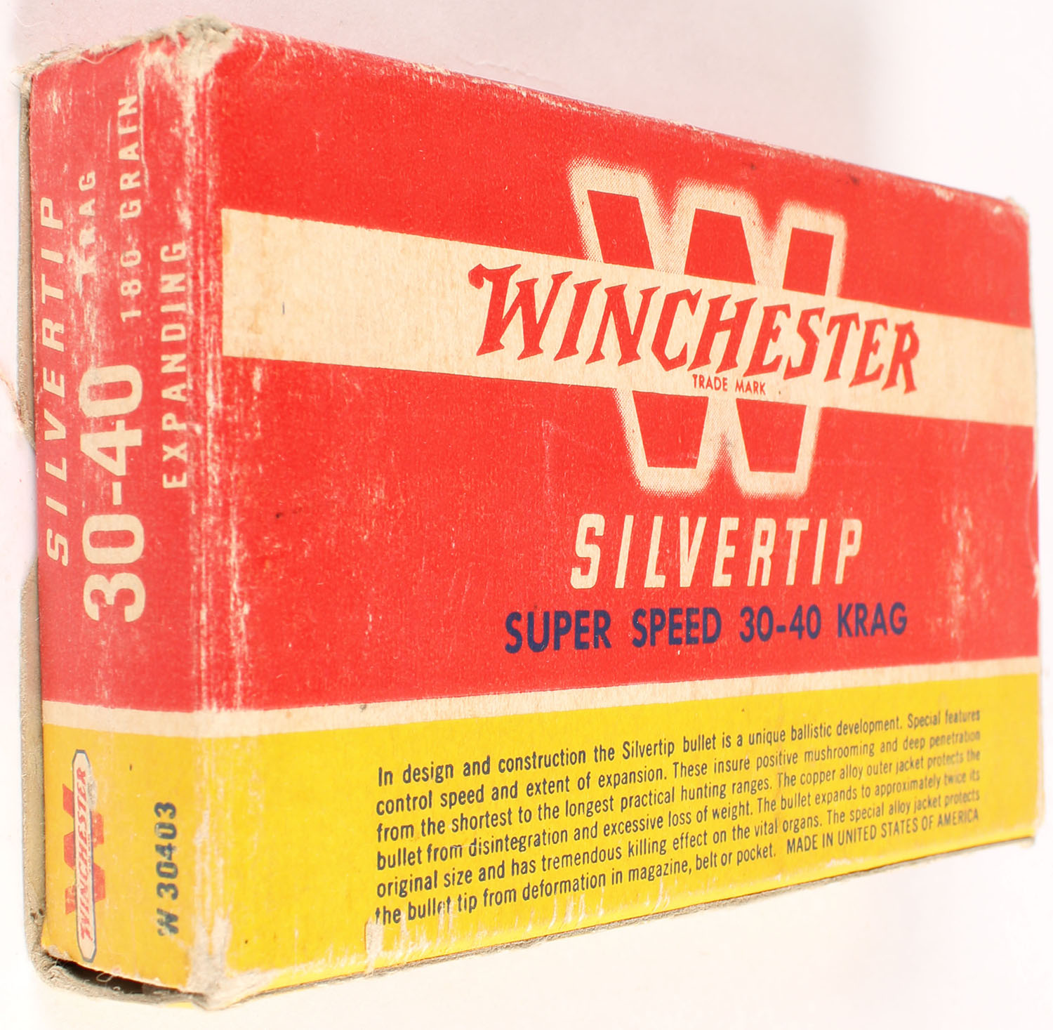 Winchester, Silvertip, .30-40 Krag (.30 Army), 180 Grain Controlled Expanding, Full, 1pc. Red yellow & white box, box is solid with very good to excellent color, some age soiling & staining, some corner wear, minor edge wear, top has been written on, end flaps are solid, ammo is excellent. Grade: Very Good ++ - Value: 20 to 80