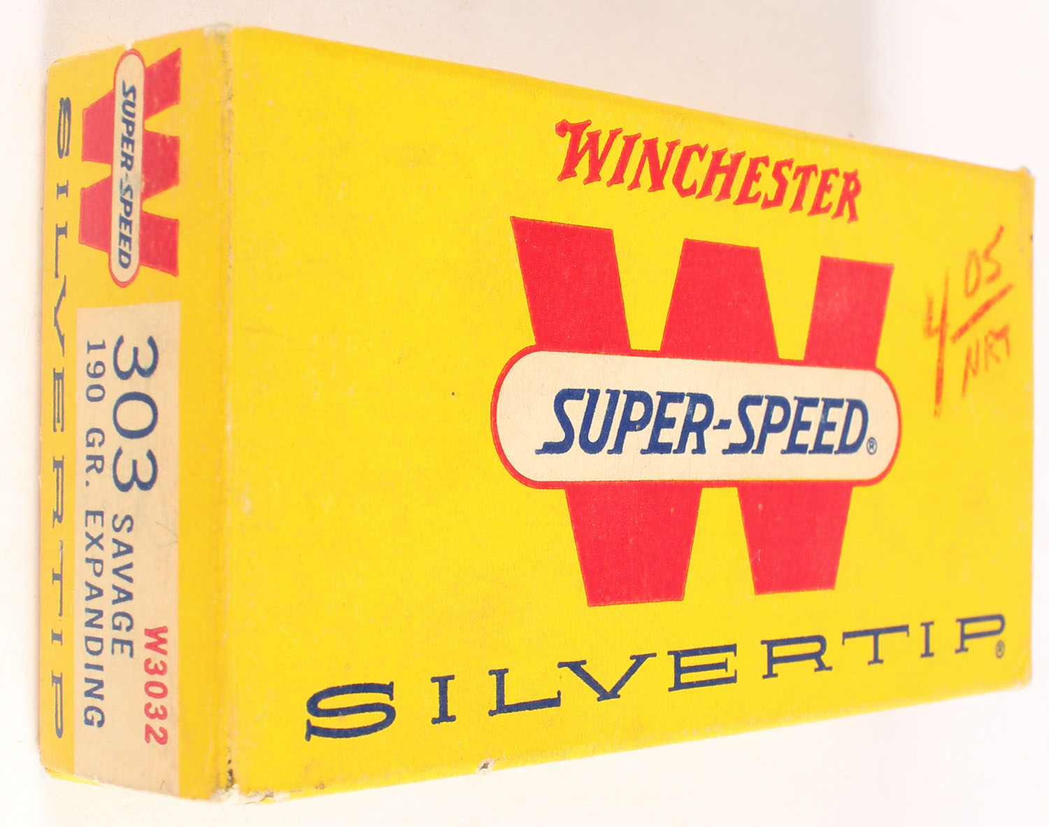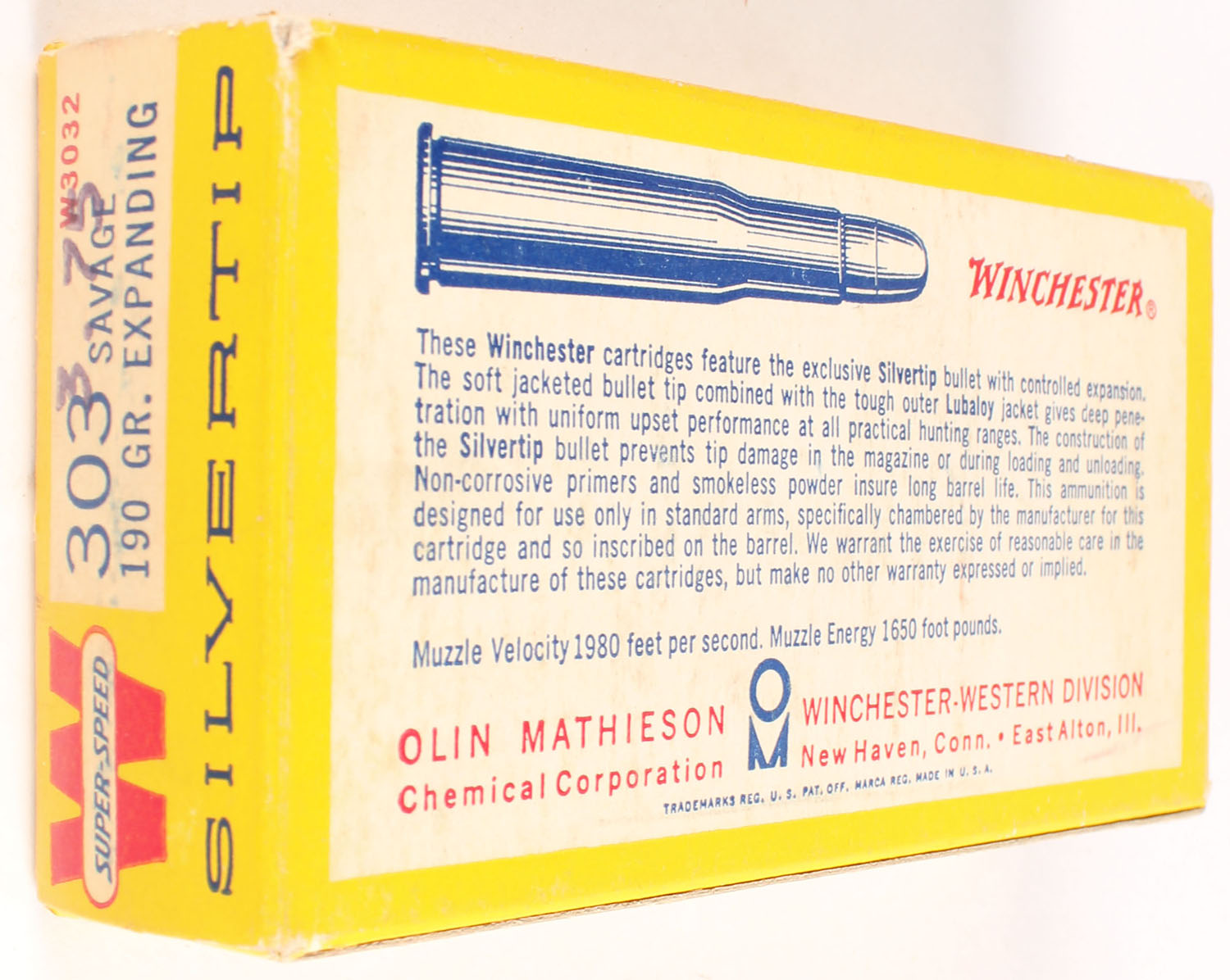 Winchester, Silvertip, .303 Savage, 190 Grain Expanding Bullet, Partial 19rds. 1pc. Yellow white & red box, box is solid with excellent color, minor age soiling, very minor corner wear, edges are crisp, top has been written on, end flaps are solid, ammo is excellent to minty. Grade: Excellent - Value: 16 to 60