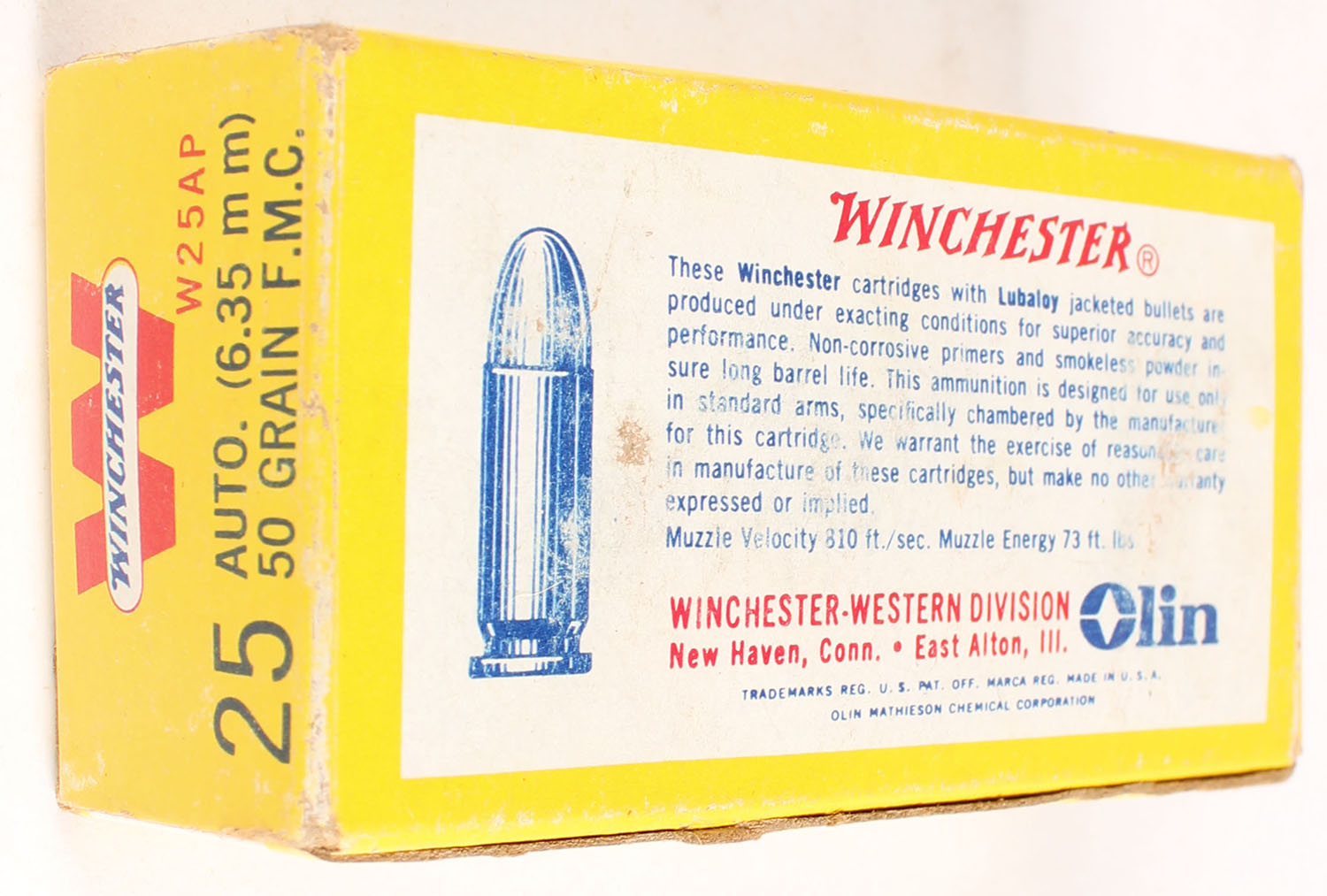 Winchester, Center Fire Cartridges, .25 Automatic (6.35mm), 50 Gr. Full Metal Case, Full, 1pc. Yellow white & red box, box is solid with excellent color, very minor shelf wear, some corner wear, minor edge wear, end flaps are solid, ammo is excellent. Grade: Excellent - Value: 10 to 40