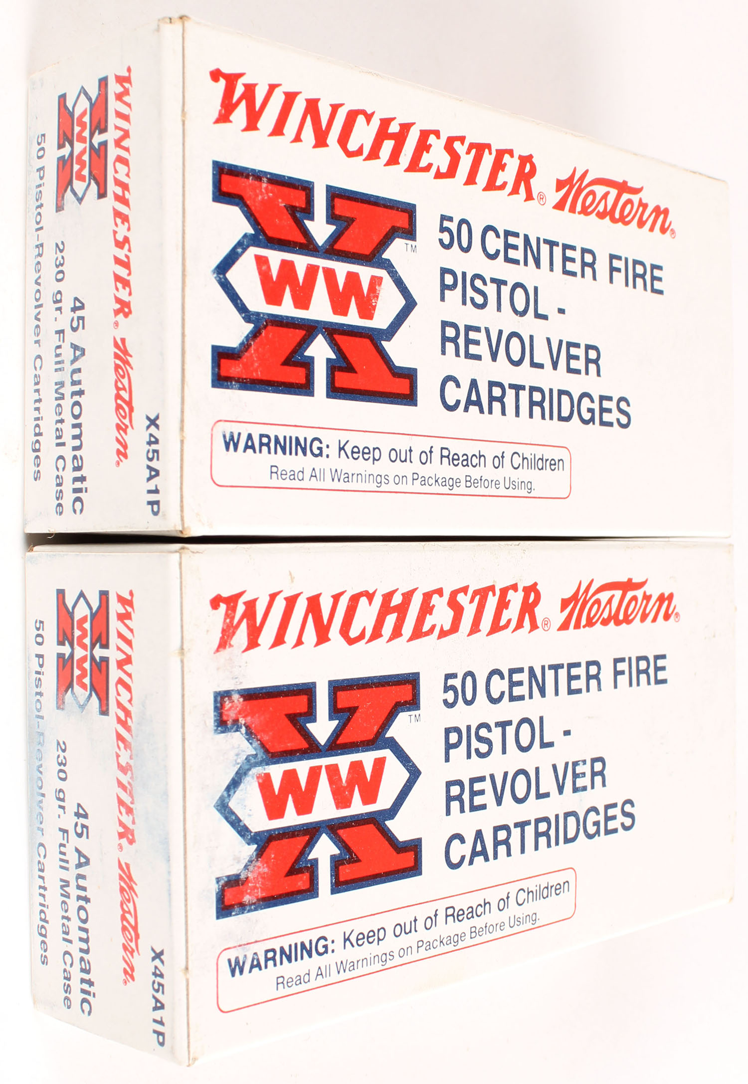 Winchester-Western, Lot of (2), X, .45 Automatic, 230 Grain Full Metal Case, both boxes full with excellent color, corners are sharp, edges are crisp, end flaps are solid, ammo is minty. Grade: Excellent ++ - Value: 20 to 60