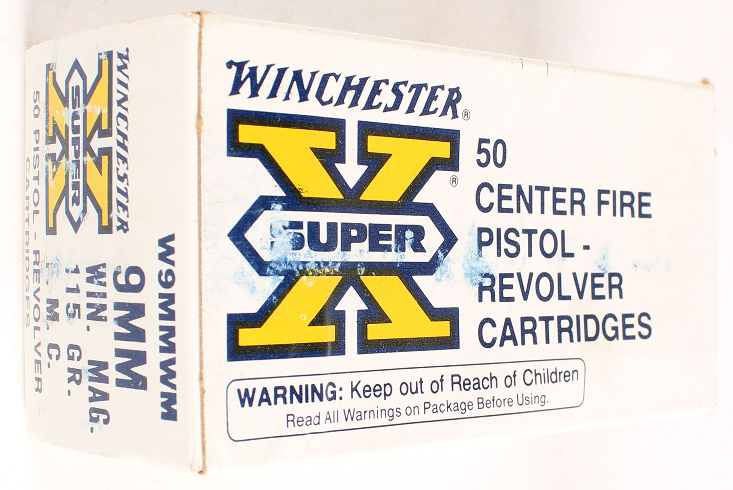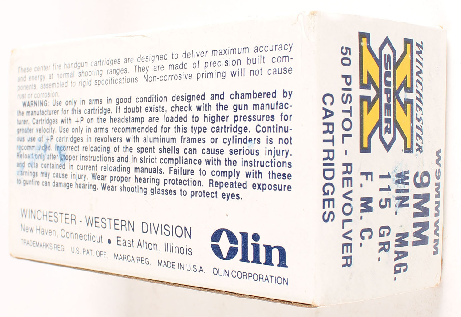 Winchester, Super-X, 9mm Winchester Magnum, 115 Grain Full Metal Case, Full, 1pc. White black & yellow box, box is solid with excellent color, some shelf & corner wear, edges are mostly crisp, end flaps are solid, ammo is very good to excellent. Grade: Excellent - Value: 30 to 90