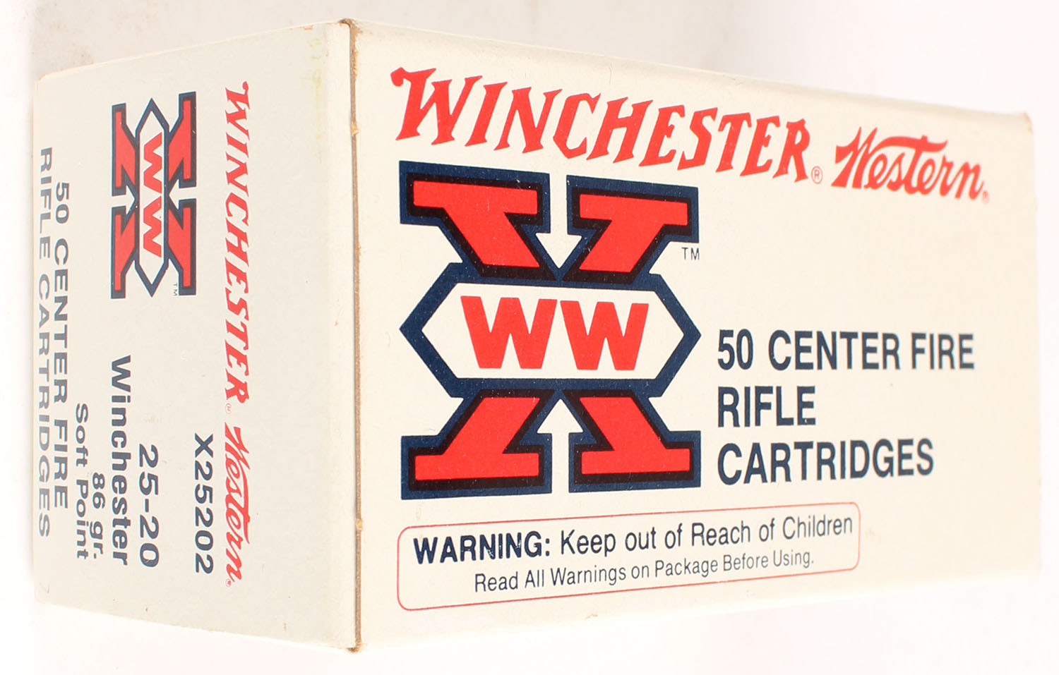 Winchester-Western, X, .25-20 Winchester, 86 Gr. Soft Point, Full, 1pc. White red & black box, box is solid with excellent color, sticker residue on right end, corners are sharp, edges are crisp, end flaps are solid, ammo is excellent. Grade: Excellent ++ - Value: 60 to 180